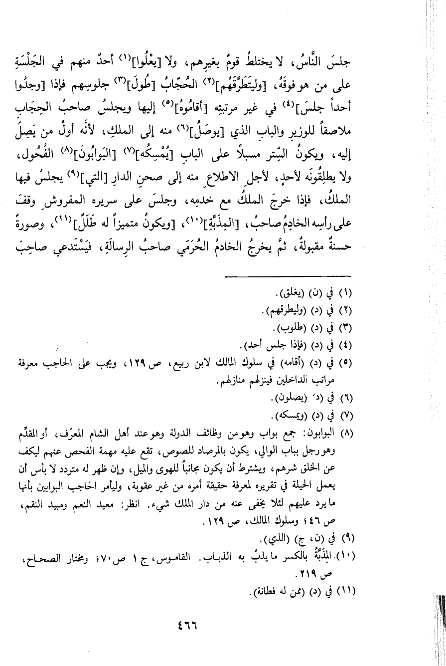جلس النَّاس لَا يخْتَلط قوم بغيرهم وَلَا يعلوا أحد مِنْهُم فِي الجلسة على من هُوَ فَوْقه وليتطرقهم الْحجاب طول جلوسهم فَإِذا وجدوا أحدا جلس فِي غير مرتبته أقاموه إِلَيْهَا وَيجْلس صَاحب الْحجاب ملاصقا للوزير وَالْبَاب الَّذِي يُوصل مِنْهُ إِلَى الْملك لِأَنَّهُ أول من يصل إِلَيْهِ وَيكون السّتْر مسبلا على الْبَاب يمسِكهُ البوابون الفحول وَلَا يطلقونه لأحد لأجل الِاطِّلَاع مِنْهُ إِلَى صحن الدَّار الَّتِي يجلس فِيهَا الْملك فَإِذا خرج الْملك مَعَ خدمه وَجلسَ على سَرِيره المفروش وقف على رَأسه الْخَادِم صَاحب المذبة وَيكون متميزا لَهُ طلل وَصُورَة حَسَنَة مَقْبُولَة ثمَّ يخرج الْخَادِم الحرمي صَاحب الرسَالَة فيستدعي صَاحب
