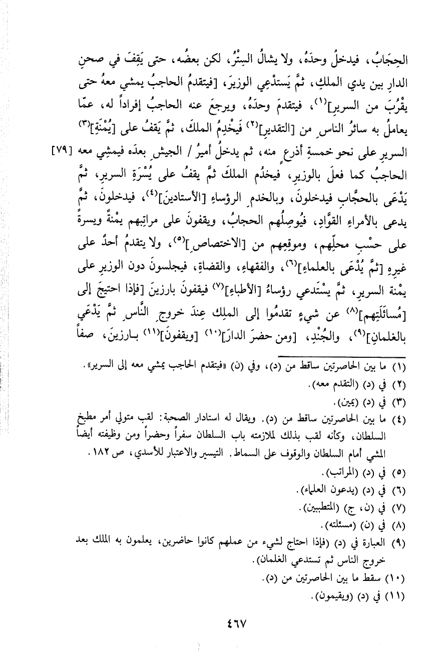 الْحجاب فَيدْخل وَحده وَلَا يشال السّتْر لَكِن بعضه حَتَّى يقف فِي صحن الدَّار بَين يَدي الْملك ثمَّ يَسْتَدْعِي الْوَزير فيتقدم الْحَاجِب يمشي مَعَه حَتَّى يقرب من السرير فيتقدم وَحده وَيرجع عَنهُ الْحَاجِب إفرادا لَهُ عَمَّا يُعَامل بِهِ سَائِر النَّاس من التَّقْدِير فيخدم الْملك ثمَّ يقف على يمنة السرير على نَحْو خَمْسَة أَذْرع مِنْهُ ثمَّ يدْخل أَمِير الْجَيْش بعده فَيَمْشِي مَعَه الْحَاجِب كَمَا فعل بالوزير فيخدم الْملك ثمَّ يقف على يسرة السرير ثمَّ يدعى بالحجاب فَيدْخلُونَ وبالخدم الرؤساء الأستاذين فَيدْخلُونَ ثمَّ يدعى بالأمراء القواد فيوصلهم الْحجاب ويقفون على مَرَاتِبهمْ يمنة ويسرة على حسب محلهم وموقعهم من الِاخْتِصَاص وَلَا يتَقَدَّم أحد على غَيره ثمَّ يدعى بالعلماء وَالْفُقَهَاء والقضاة فَيَجْلِسُونَ دون الْوَزير على يمنة السرير ثمَّ يَسْتَدْعِي رُؤَسَاء الْأَطِبَّاء فيقفون بارزين فَإِذا احْتِيجَ إِلَى مسائلتهم عَن شَيْء تقدمُوا إِلَى الْملك عِنْد خُرُوج النَّاس ثمَّ يَدعِي بالغلمان والجند وَمن حضر الدَّار ويقفون بارزين صفا