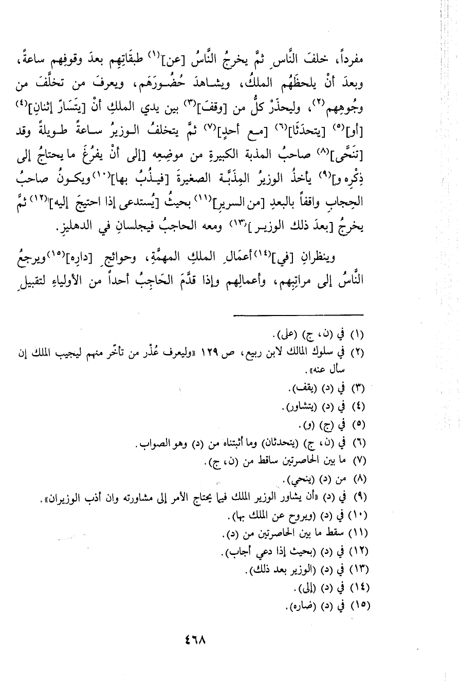 مُفردا خلف النَّاس ثمَّ يخرج النَّاس عَن طبقاتهم بعد وقوفهم سَاعَة وَبعد أَن يلحظهم الْملك ويشاهد حضورهم وَيعرف من تخلف من وُجُوههم وليحذر كل من وقف بَين يَدي الْملك أَن يتسار إثنان أَو يتحدثا مَعَ أحد ثمَّ يتَخَلَّف الْوَزير سَاعَة طَوِيلَة وَقد تنحى صَاحب المذبة الْكَبِيرَة من مَوْضِعه إِلَى أَن يفرغ مَا يحْتَاج إِلَى ذكره وَيَأْخُذ الْوَزير المذبة الصَّغِيرَة فيذب بهَا وَيكون صَاحب الْحجاب وَاقِفًا بالبعد من السرير بِحَيْثُ يَسْتَدْعِي إِذا احْتِيجَ إِلَيْهِ ثمَّ يخرج بعد ذَلِك الْوَزير وَمَعَهُ الْحَاجِب فيجلسان فِي الدهليز