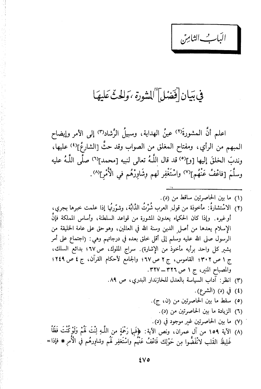 اعْلَم أَن المشورة عين الْهِدَايَة وسبيل الرشاد إِلَى الْأَمر وإيضاح الْمُبْهم من الرَّأْي ومفتاح المغلق من الصَّوَاب وَقد حث الشَّارِع عَلَيْهَا وَندب الْخلق إِلَيْهَا وَقد قَالَ الله تَعَالَى لنَبيه مُحَمَّد ص = فَاعْفُ عَنْهُم واستغفر لَهُم وشاورهم فِي الْأَمر