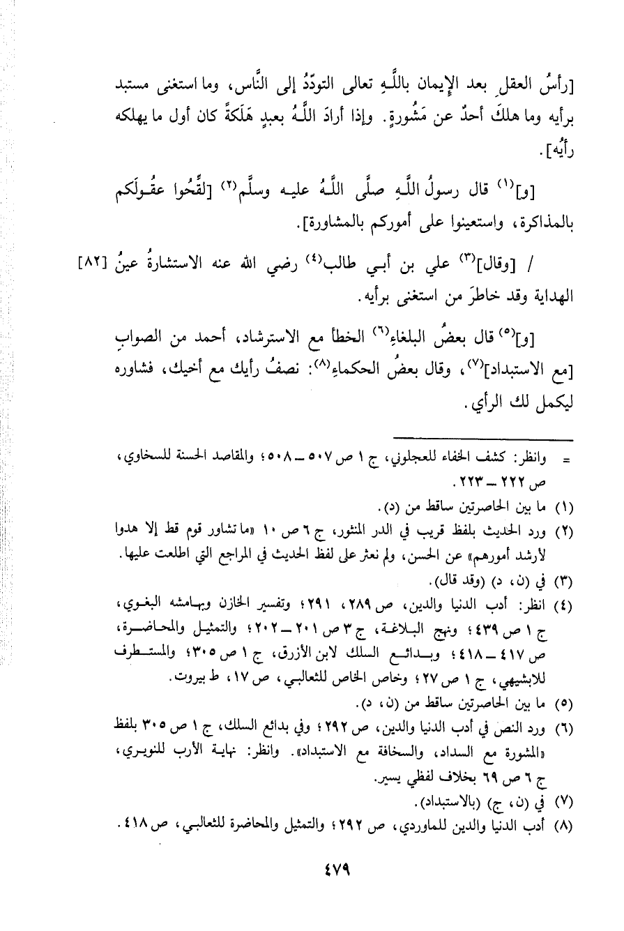 وَقَالَ بعض البلغاء الْخَطَأ مَعَ الاسترشاد أَحْمد من الصَّوَاب مَعَ الاستبداد وَقَالَ بعض الْحُكَمَاء نصف رَأْيك مَعَ أَخِيك فشاوره ليكمل لَك الرَّأْي