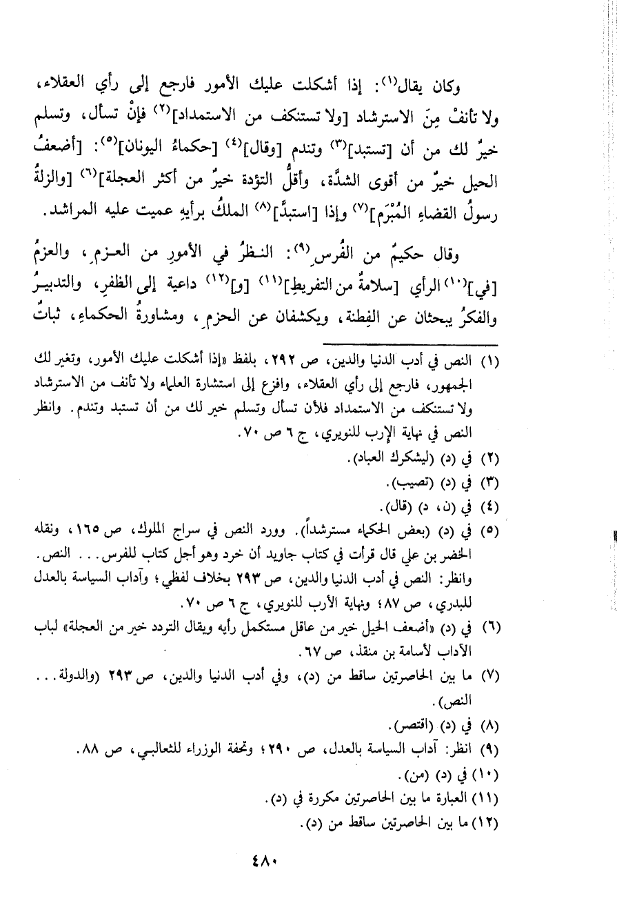 وَكَانَ يُقَال إِذا أشكلت عَلَيْك الْأُمُور فَارْجِع إِلَى رَأْي الْعُقَلَاء وَلَا تأنف من الاسترشاد وَلَا تستنكف من الاستمداد فَإِن تسْأَل وتسلم خير لَك من أَن تستبد وتندم وَقَالَ حكماء اليونان أَضْعَف الْحِيَل خير من أقوى الشدَّة وَأَقل التؤدة خير من أَكثر العجلة والزلة رَسُول الْقَضَاء المبرم وَإِذا استبد الْملك بِرَأْيهِ عميت عَلَيْهِ المراشد