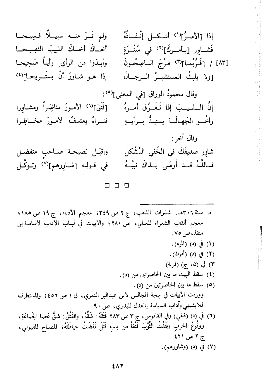(فَشَاور بِأَمْرك فِي ستْرَة ... أَخَاك أَخَاك اللبيب النصيحا)