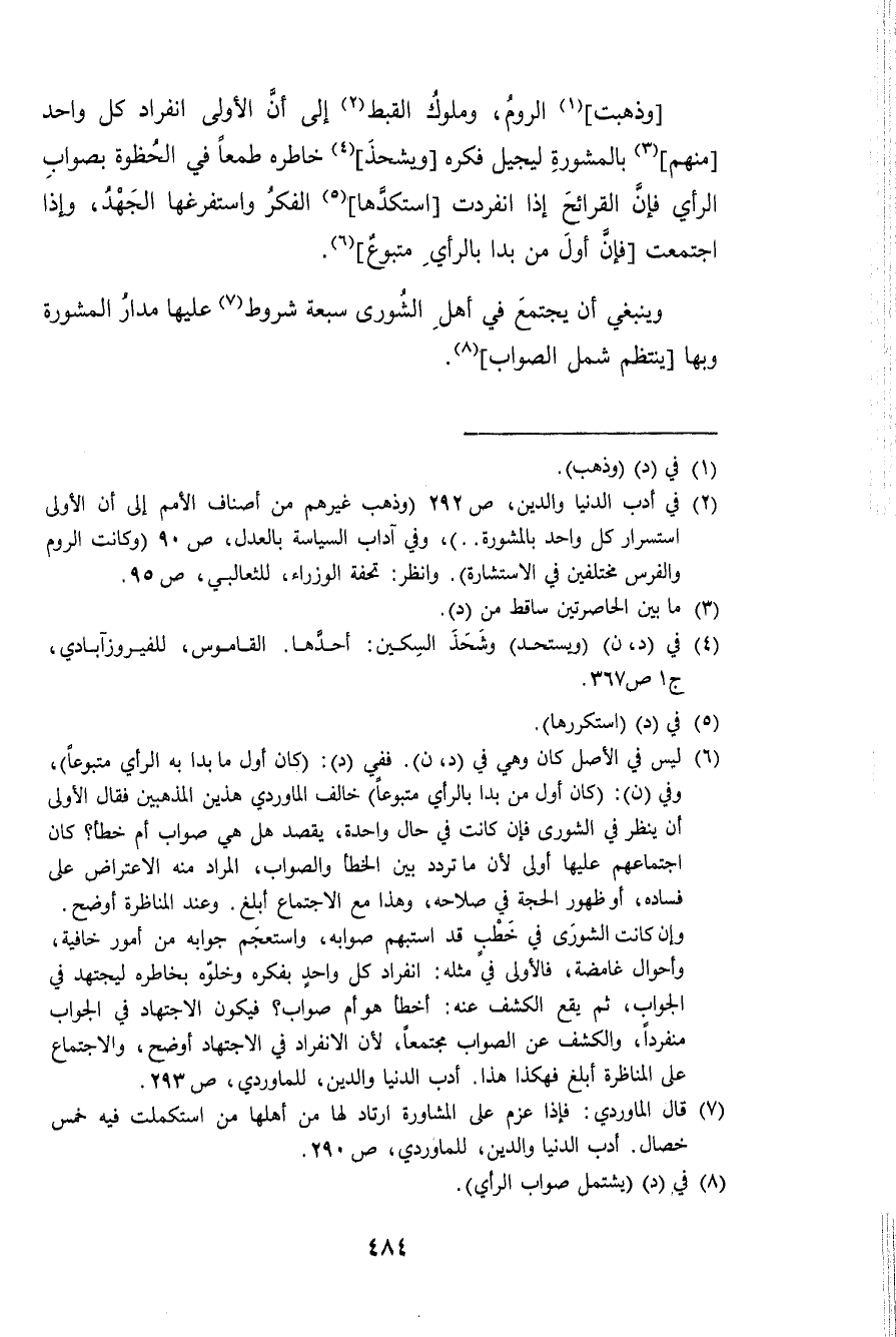 وَيَنْبَغِي أَن يجْتَمع فِي أهل الشورى سَبْعَة شُرُوط عَلَيْهَا مدَار المشورة وَبهَا يَنْتَظِم شَمل الصَّوَاب