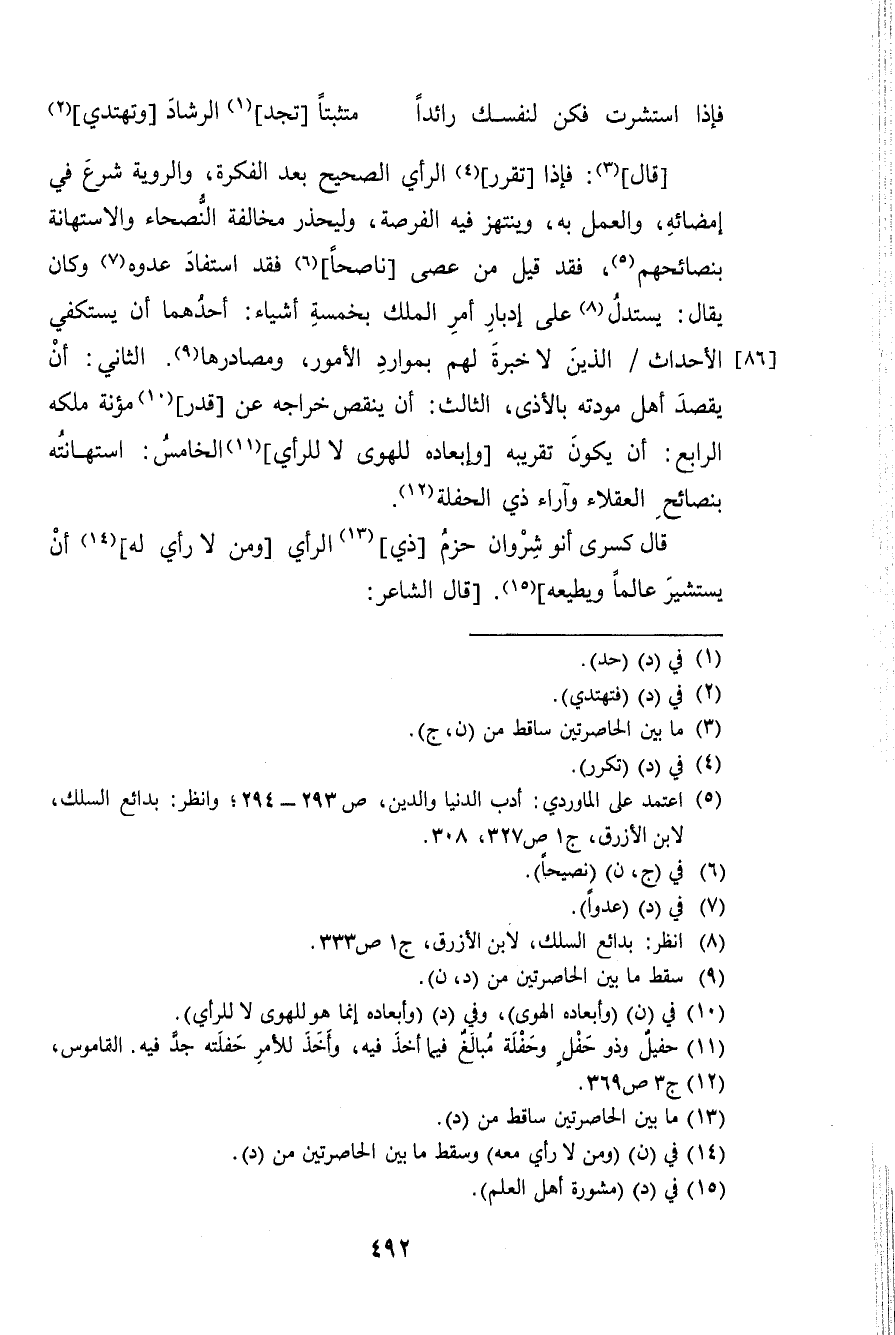 قَالَ فَإِذا تقرر الرَّأْي الصَّحِيح بعد الفكرة والروية شرع فِي إمضائه وَالْعَمَل بِهِ وينتهز فِيهِ الفرصة وليحذر مُخَالفَة النصحاء والاستهانة بنصائحهم فقد قيل من عصى ناصحا فقد اسْتَفَادَ عدوه وَكَانَ يُقَال يسْتَدلّ على إدبار أَمر الْملك بِخَمْسَة أَشْيَاء أَحدهمَا أَن يستكفي الْأَحْدَاث الَّذين لَا خبْرَة لَهُم بموارد الْأُمُور ومصادرها الثَّانِي أَن يقْصد أهل مودته بالأذى الثَّالِث أَن ينقص خراجه عَن قدر مُؤنَة ملكه الرَّابِع أَن يكون تقريبه وإبعاده للهوى لَا للرأي الْخَامِس استهانته بنصائح الْعُقَلَاء وآراء ذِي الحفلة