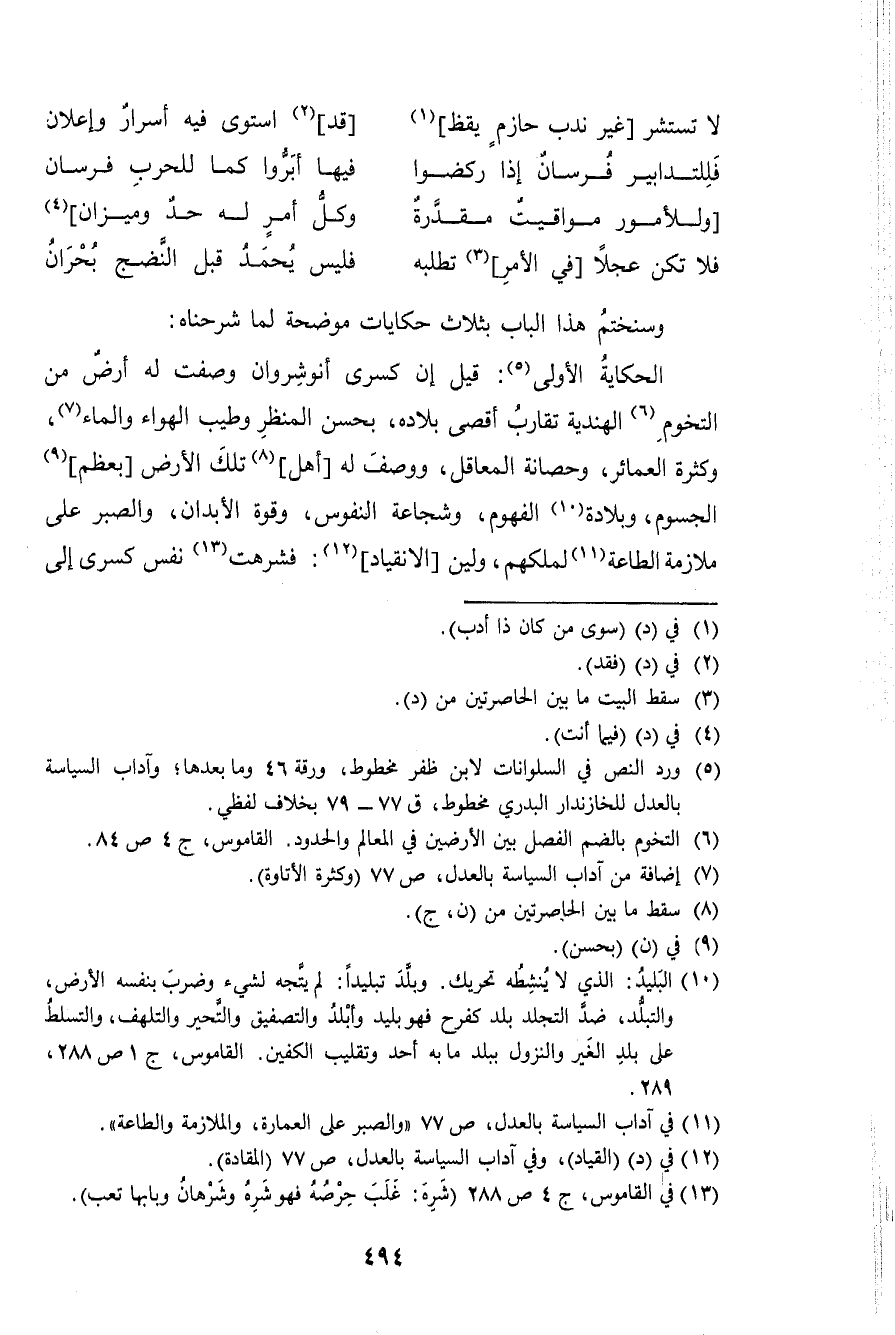 الْحِكَايَة الأولى قيل إِن كسْرَى أنوشروان وصفت لَهُ أَرض من التخوم الْهِنْدِيَّة تقَارب أقْصَى بِلَاده بِحسن المنظر وَطيب الْهَوَاء وَالْمَاء وَكَثْرَة العمائر وحصانة المعاقل وَوصف لَهُ أهل تِلْكَ الأَرْض بِعظم الجسوم وبلاده الفهوم وشجاعة النُّفُوس وَقُوَّة الْأَبدَان وَالصَّبْر على مُلَازمَة الطَّاعَة لملكهم ولين الانقياد فشرهت نفس كسْرَى إِلَى