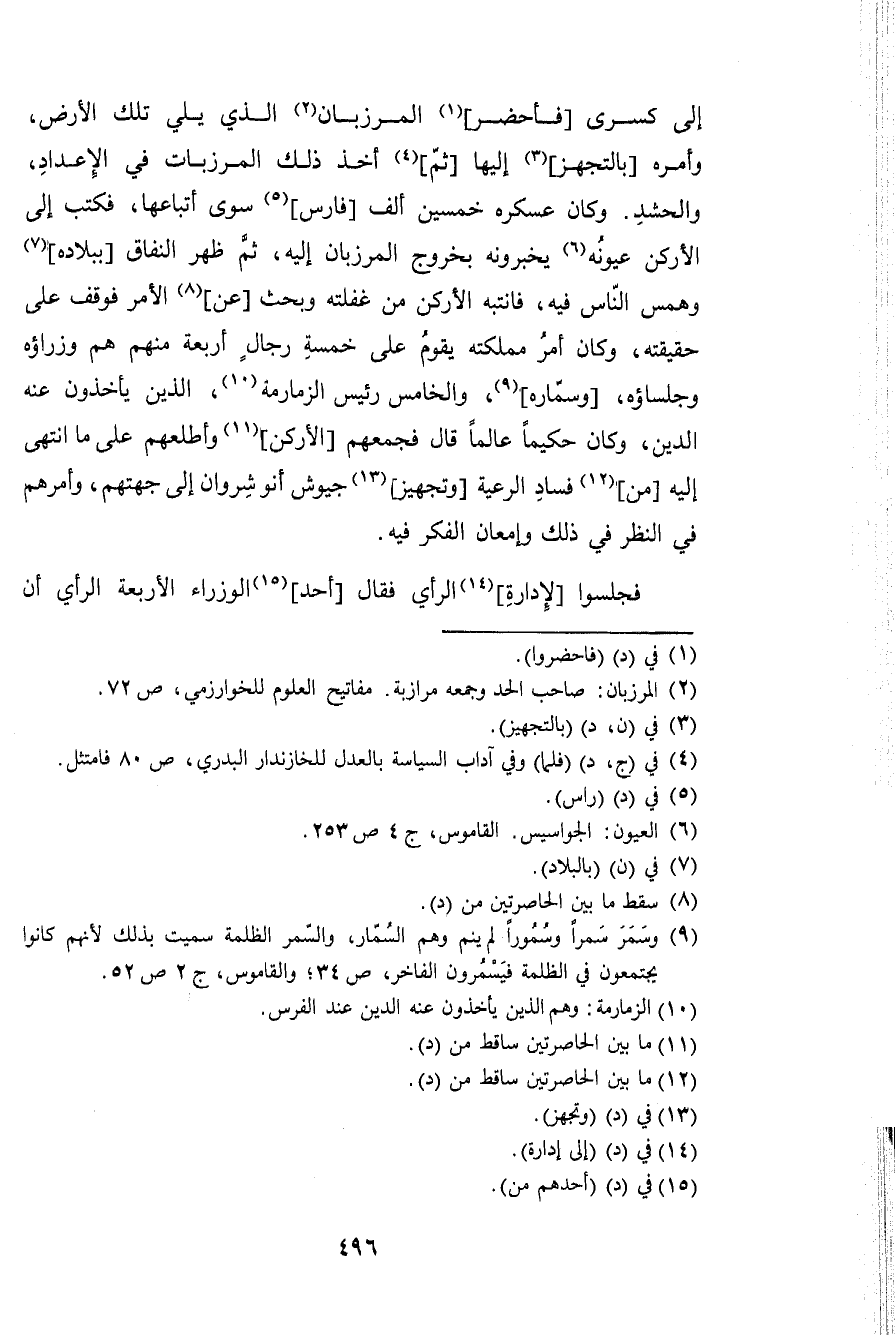 إِلَى كسْرَى فأحضر الْمَرْزُبَان الَّذِي يَلِي تِلْكَ الأَرْض وَأمره بالتجهيز إِلَيْهَا ثمَّ أَخذ ذَلِك المرزبات فِي الإعداد والحشد وَكَانَ عسكره خمسين ألف فَارس سوى أتباعها فَكتب إِلَى الأركن عيونه يخبرونه بِخُرُوج الْمَرْزُبَان إِلَيْهِ ثمَّ ظهر النِّفَاق ببلاده وهمس النَّاس فِيهِ فانتبه الأركن من غفلته وَبحث عَن الْأَمر فَوقف على حَقِيقَته وَكَانَ امْر مَمْلَكَته يقوم على خَمْسَة رجال أَرْبَعَة مِنْهُم وزراؤه وجلساؤه وسماره وَالْخَامِس رَئِيس الزمارمة الَّذين يَأْخُذُونَ عَنهُ الدّين وَكَانَ حكيما عَالما قَالَ فَجَمعهُمْ الأركن وأطلعهم على مَا انْتهى إِلَيْهِ من فَسَاد الرّعية وتجهيز جيوش أنو شرْوَان إِلَى جهتهم وَأمرهمْ فِي النّظر فِي ذَلِك وإمعان الْفِكر فِيهِ