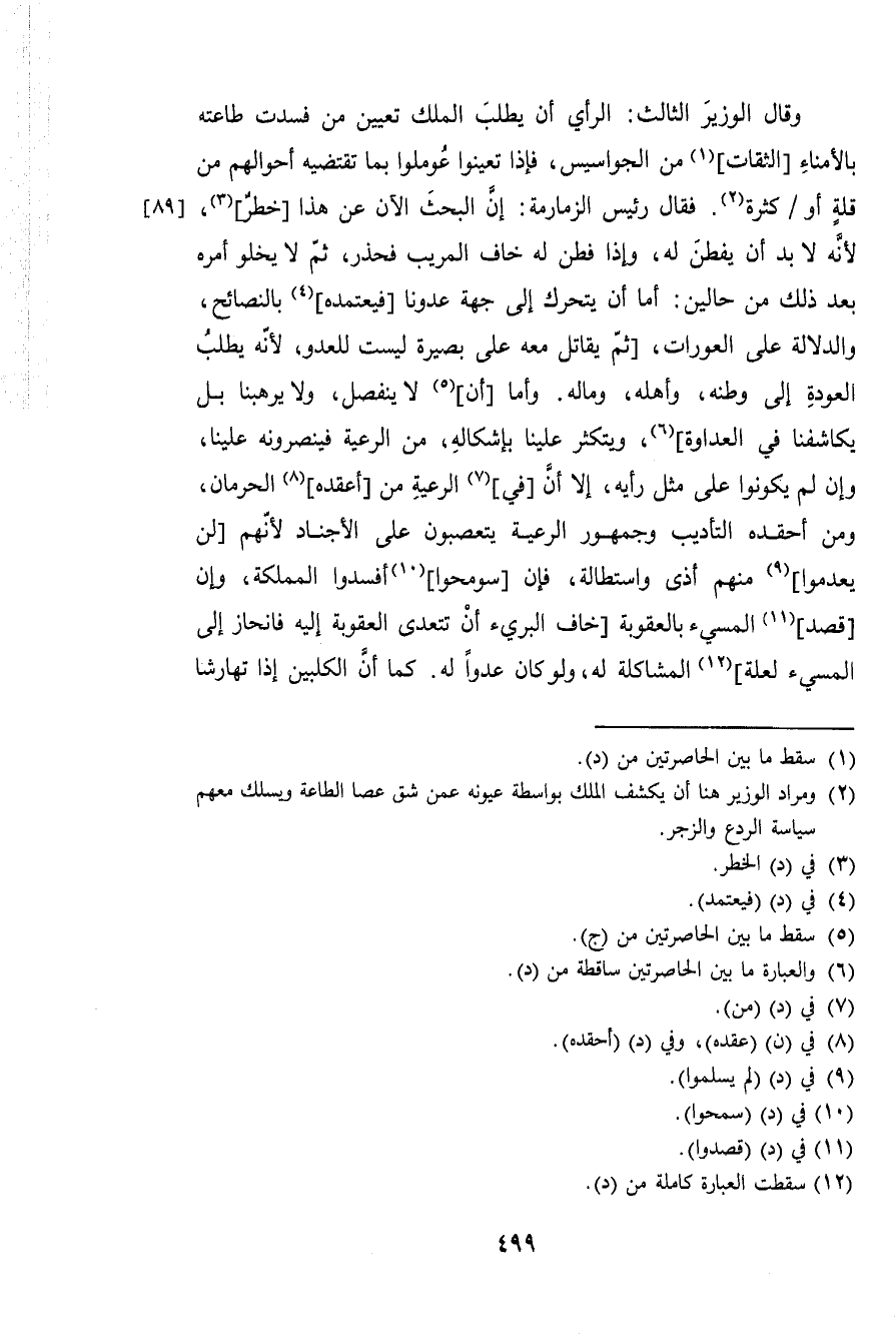 وَقَالَ الْوَزير الثَّالِث الراي ان يطْلب الْملك تعْيين من فَسدتْ طَاعَته بالأمناء الثِّقَات من الجواسيس فَإِذا تعينُوا عوملوا بِمَا تَقْتَضِيه أَحْوَالهم من قلَّة أَو كَثْرَة فَقَالَ رَئِيس الزمارمة إِن الْبَحْث الان عَن هَذَا خطر لِأَنَّهُ لابد أَن يفْطن لَهُ وَإِذا فطن لَهُ خَافَ الْمُرِيب فحذر ثمَّ لايخلو أمره بعد ذَلِك من حَالين أما أَن يَتَحَرَّك إِلَى جِهَة عدونا فيعتمده بالنصائح وَالدّلَالَة على العورات ثمَّ يُقَاتل مَعَه بَصِيرَة لَيست لِلْعَدو لِأَنَّهُ يطْلب العودة إِلَى وَطنه وَأَهله وَمَاله وَأما أَن لَا ينْفَصل وَلَا يرهبنا بل يكاشفنا فِي الْعَدَاوَة ويتكثر علينا بإشكاله من الرّعية فينصرونه علينا وَإِن لم يَكُونُوا على مثل رَأْيه إِلَّا أَن فِي الرّعية من أعقده الحرمان وَمن أحقده التَّأْدِيب وَجُمْهُور الرّعية يتعصبون على الأجناد لأَنهم لن يعدموا مِنْهُم أَذَى واستطالة فَإِن سومحوا أفسدوا المملكة وَإِن قصد الْمُسِيء بالعقوبة خَافَ البريء أَن تتعدى الْعقُوبَة إِلَيْهِ فانحاز إِلَى الْمُسِيء لَعَلَّه المشاكلة لَهُ وَلَو كَانَ عدوا لَهُ كَمَا أَن الكلبين إِذا تهارشا