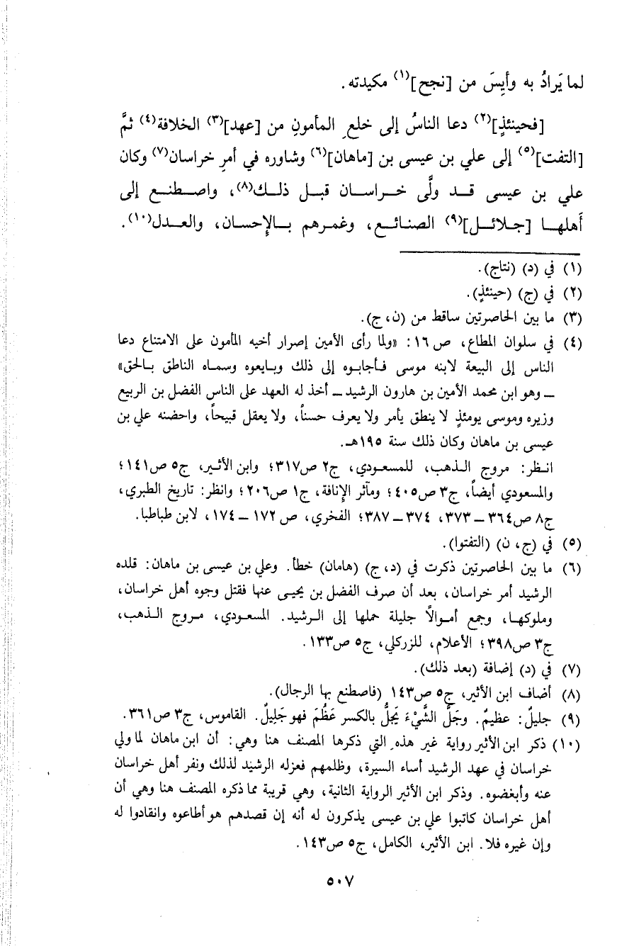 فَحِينَئِذٍ دَعَا النَّاس إِلَى خلع الْمَأْمُون من عهد الْخلَافَة ثمَّ الْتفت إِلَى عَليّ بن عِيسَى بن ماهان وشاوره فِي أَمر خُرَاسَان وَكَانَ عَليّ بن عِيسَى قد ولى خُرَاسَان قبل ذَلِك واصطنع إِلَى أَهلهَا جلائل الصَّنَائِع وغمرهم بِالْإِحْسَانِ وَالْعدْل