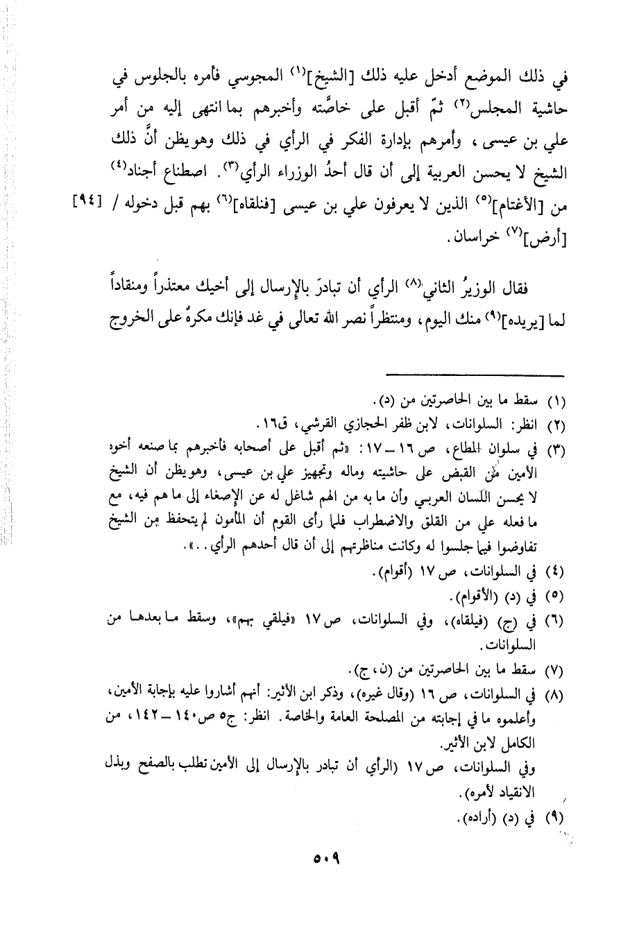 فِي ذَلِك الْموضع أَدخل عَلَيْهِ ذَلِك الشَّيْخ الْمَجُوسِيّ فَأمره بِالْجُلُوسِ فِي حَاشِيَة الْمجْلس ثمَّ أقبل على خاصته وَأخْبرهمْ بِمَا انْتهى إِلَيْهِ من أَمر عَليّ بن عِيسَى وَأمرهمْ بإدارة الْفِكر فِي الرَّأْي فِي ذَلِك وَهُوَ يظنّ أَن ذَلِك الشَّيْخ لَا يحسن الْعَرَبيَّة إِلَى أَن قَالَ أحد الوزراء الرَّأْي اصطناع أجناد من الأغنام الَّذين لَا يعْرفُونَ عَليّ بن عِيسَى فنلقاه بهم قبل دُخُوله أَرض خُرَاسَان