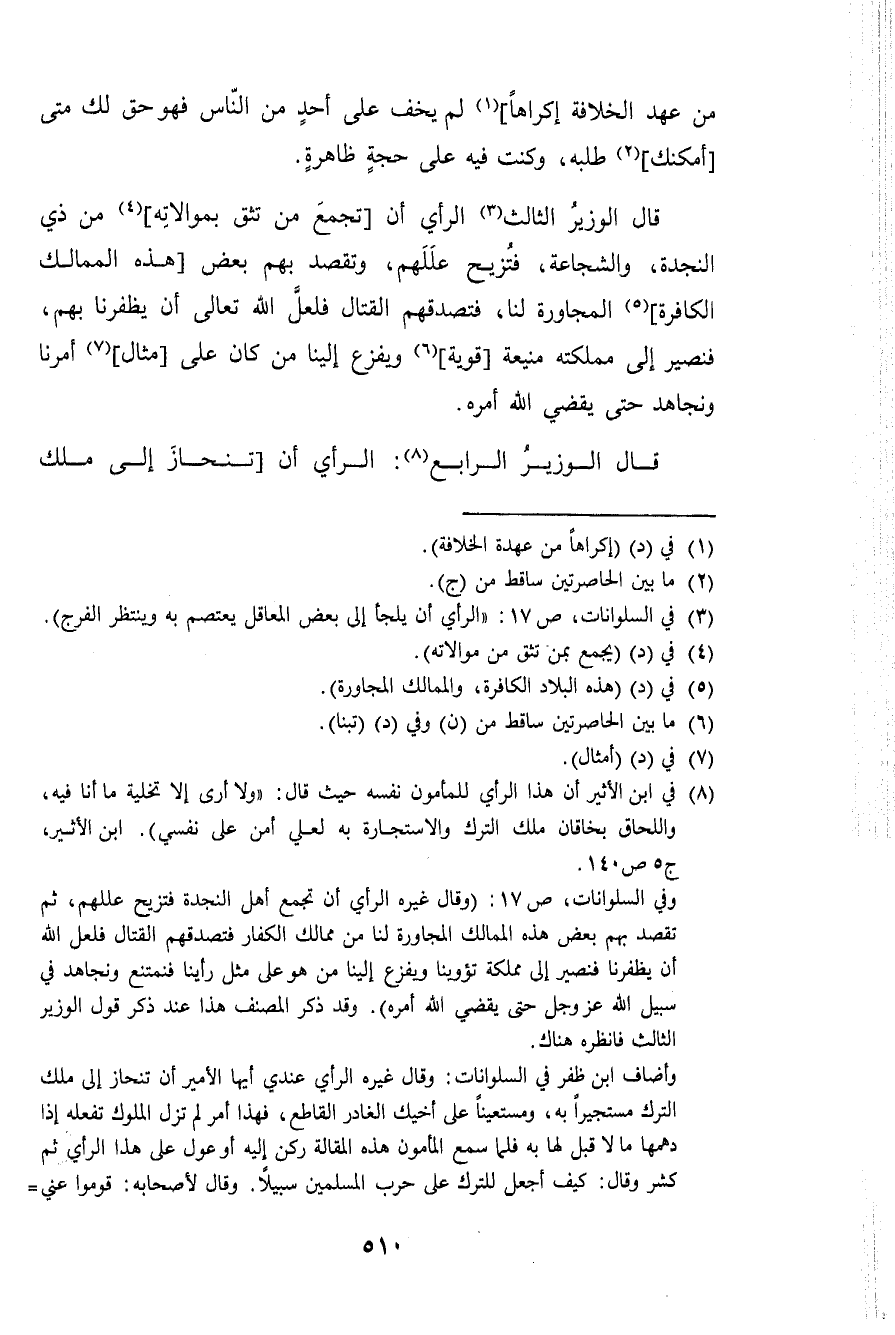 قَالَ الْوَزير الثَّالِث الرَّأْي أَن تجمع من تثق بموالاته من ذِي النجدة والشجاعة فتزيح عللهم وتقصد بهم بعض هَذِه الممالك الْكَافِرَة الْمُجَاورَة لنا فتصدقهم الْقِتَال فَلَعَلَّ الله تَعَالَى أَن يظفرنا بهم فنصير إِلَى مَمْلَكَته منيعة قَوِيَّة ويفزع إِلَيْنَا من كَانَ على مِثَال أمرنَا ونجاهد حَتَّى يقْضِي الله أمره