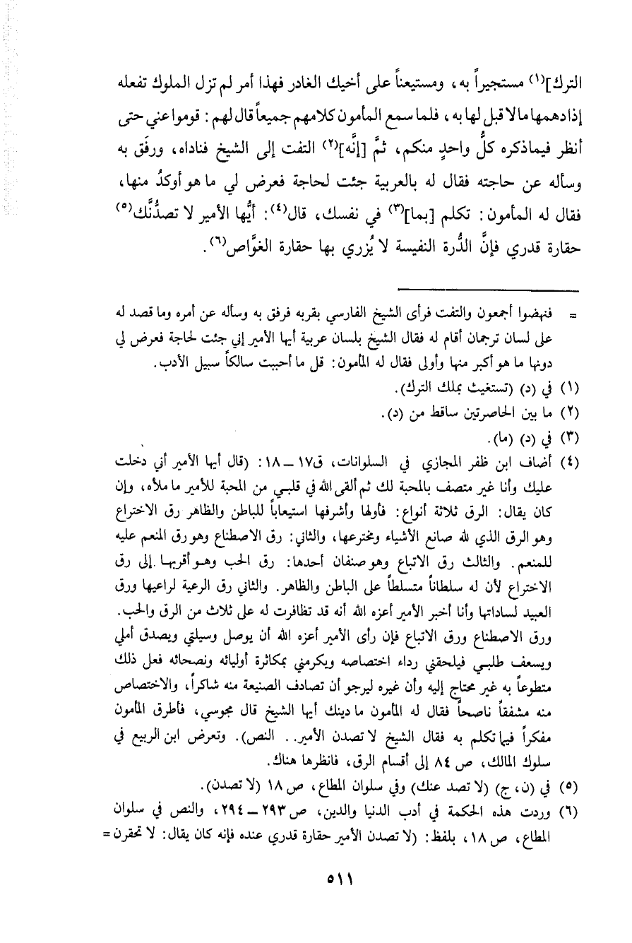 التّرْك مستجيرا بِهِ ومستيعنا على اخيك الغادر فَهَذَا أَمر لم تزل الْمُلُوك تَفْعَلهُ إِذا دهمها مَالا قبل لَهَا بِهِ فَلَمَّا سمع الْمَأْمُون كَلَامهم جَمِيعًا قَالَ لَهُم قومُوا عني حَتَّى أنظر فِيمَا ذكره كل وَاحِد مِنْكُم ثمَّ إِنَّه الْتفت إِلَى الشَّيْخ فناداه ورفق بِهِ وَسَأَلَهُ عَن حَاجته فَقَالَ لَهُ بِالْعَرَبِيَّةِ جِئْت لحَاجَة فَعرض لي مَا هُوَ أوكد مِنْهَا فَقَالَ لَهُ المامون تكلم بِمَا فِي نَفسك قَالَ أَيهَا الْأَمِير لَا تصدنك حقارة قدري فَإِن الدرة النفسية لَا يزري بهَا حقارة الغواص