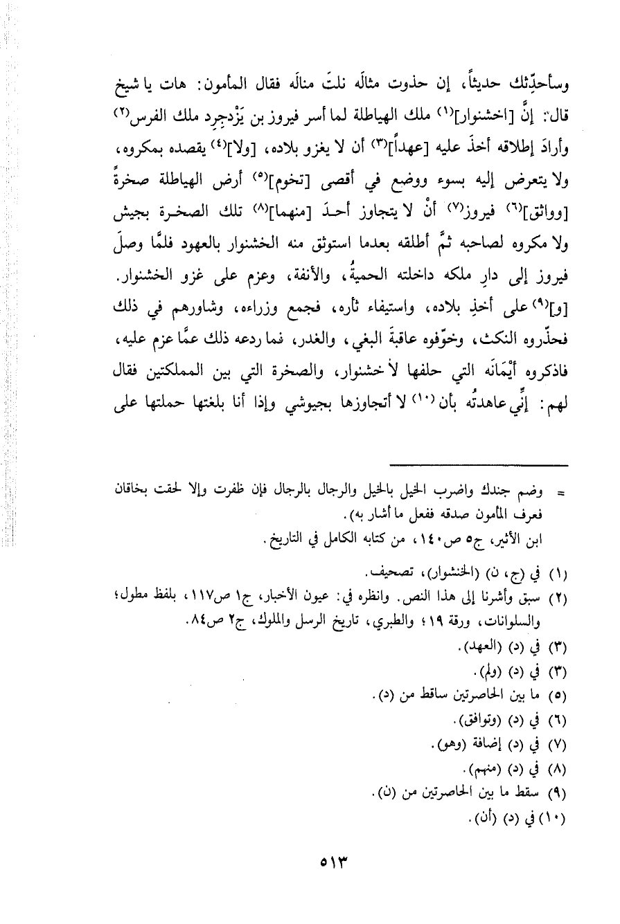 وسأحدثك حَدِيثا إِن حذوت مِثَاله نلْت مناله فَقَالَ الْمَأْمُون هَات يَا شيخ قَالَ إِن اخشنوار ملك الهياطلة لما أسر فَيْرُوز بن يزدجرد ملك الْفرس وَأَرَادَ إِطْلَاقه أَخذ عَلَيْهِ عهدا أَن لَا يَغْزُو بِلَاده وَلَا يَقْصِدهُ بمكروه وَلَا يتَعَرَّض إِلَيْهِ بِسوء وَوضع فِي أقْصَى تخوم أَرض الهياطلة صَخْرَة وواثق فَيْرُوز أَن لَا يتَجَاوَز أحد مِنْهُمَا تِلْكَ الصَّخْرَة بِجَيْش وَلَا مَكْرُوه لصَاحبه ثمَّ أطلقهُ بَعْدَمَا استوثق مِنْهُ الخشنوار بالعهود فَلَمَّا وصل فَيْرُوز إِلَى دَار ملكه داخلته الحمية والأنفة وعزم على غَزْو الخشنوار وعَلى أَخذ بِلَاده وَاسْتِيفَاء ثَأْره فَجمع وزراءه وشاورهم فِي ذَلِك فحذروه النكث وخوفوه عَاقِبَة الْبَغي والغدر فَمَا ردعه ذَلِك عَمَّا عزم عَلَيْهِ فاذكروه أيمانه الَّتِي حَلفهَا لَا خشنوار والصخرة الَّتِي بَين المملكتين فَقَالَ لَهُم إِنِّي عاهدته بِأَن لَا أتجاوزها بجيوشي وَإِذا أَنا بلغتهَا حملتها على