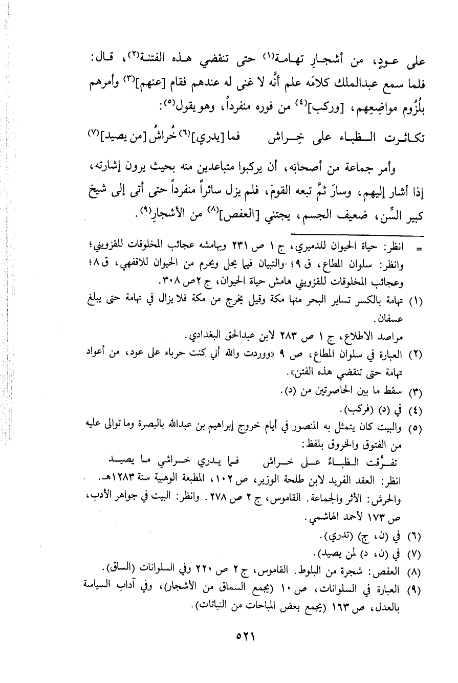 على عود من أَشجَار تهَامَة حَتَّى تَنْقَضِي هَذِه الْفِتْنَة قَالَ فَلَمَّا سمع عبد الْملك كَلَامه علم أَنه لَا غنى لَهُ عِنْدهم فَقَامَ عَنْهُم وَأمرهمْ بِلُزُوم مواضعهم وَركب من فوره مُنْفَردا وَهُوَ يَقُول