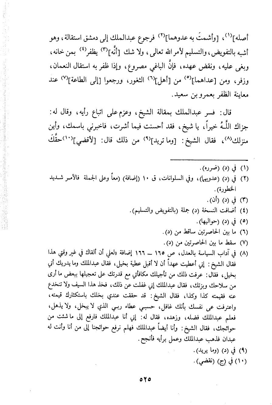 قَالَ فسر عبد الْملك بمقاله الشَّيْخ وعزم على اتِّبَاع رَأْيه وَقَالَ لَهُ جَزَاك الله خيرا يَا شيخ فقد أَحْسَنت فِيمَا أَشرت فاخبرني بِاسْمِك وَأَيْنَ مَنْزِلك فَقَالَ الشَّيْخ وَمَا تُرِيدُ من ذَلِك قَالَ لأقضي حَقك