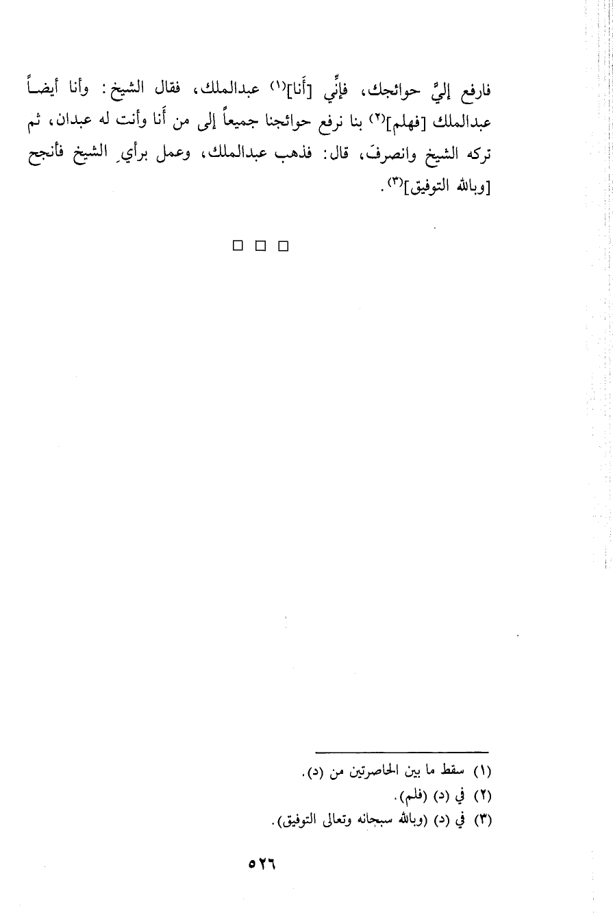 فارفع إِلَيّ حوائجك فَإِنِّي أَنا عبد الْملك فَقَالَ الشَّيْخ وَأَنا أَيْضا عبد الْملك فَهَلُمَّ بِنَا نرفع حوائجنا جَمِيعًا إِلَى من أَنا وَأَنت لَهُ عَبْدَانِ ثمَّ تَركه الشَّيْخ وَانْصَرف قَالَ فَذهب عبد الْملك وَعمل بِرَأْي الشَّيْخ فأنجح وَبِاللَّهِ التَّوْفِيق