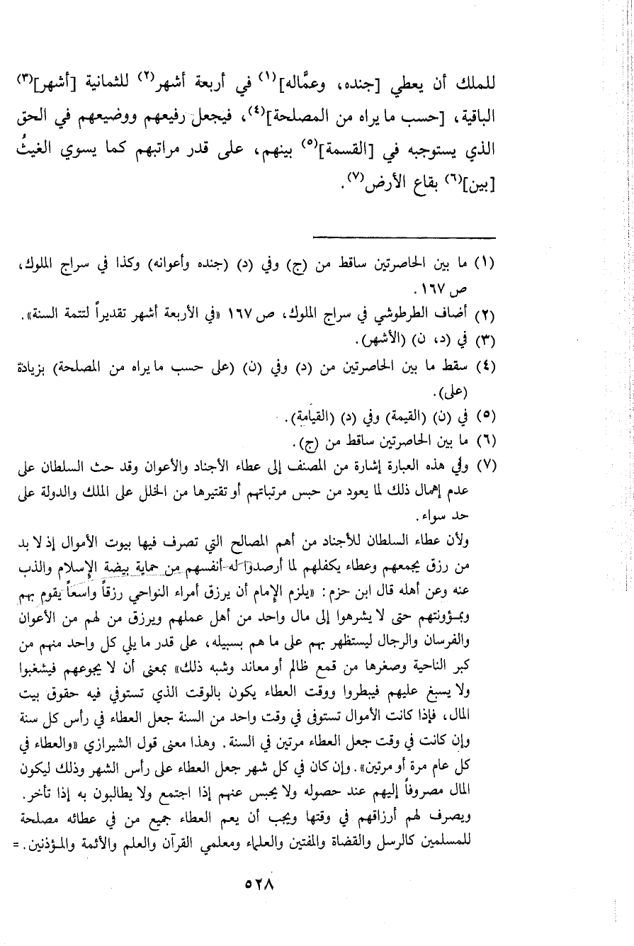 للْملك أَن يُعْطي جنده وعماله فِي أَرْبَعَة أشهر للثمانية أشهر الْبَاقِي حسب مَا يرَاهُ من الْمصلحَة فَيجْعَل رفيعهم ووضيعهم فِي الْحق الَّذِي يستوجبه فِي الْقِسْمَة بَينهم على قدر مَرَاتِبهمْ كَمَا يُسَوِّي الْغَيْث بَين بقاع الأَرْض