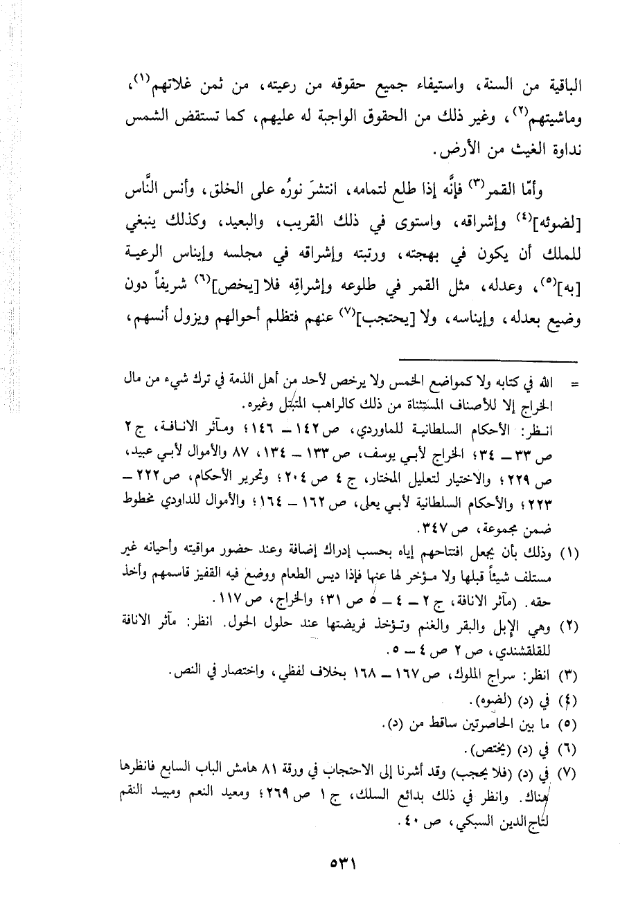 وَأما الْقَمَر فَإِنَّهُ إِذا طلع لتمامه انْتَشَر نوره على الْخلق وَأنس النَّاس لضوئة وإشراقه واستوى فِي ذَلِك الْقَرِيب والبعيد وَكَذَلِكَ يَنْبَغِي للْملك أَن يكون فِي بهجته ورتبته وإشراقه فِي مَجْلِسه وإيناس الرّعية بِهِ وعدله مثل الْقَمَر فِي طلوعه وإشراقه فَلَا يخص شريفا دون وضيع بعدله وإيناسه وَلَا يحتجب عَنْهُم فتظلم أَحْوَالهم وَيَزُول أنسهم
