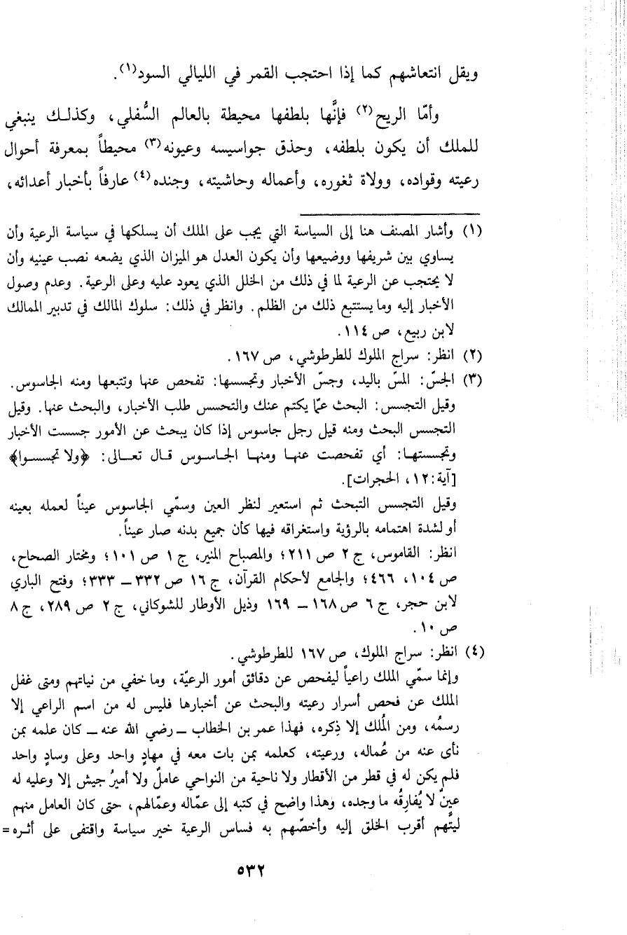 وَأما الرّيح فَإِنَّهَا بلطفها مُحِيطَة بالعالم السفلي وَكَذَلِكَ يَنْبَغِي للْملك أَن يكون بِلُطْفِهِ وحذق جواسيسه وعيونه محيطا بِمَعْرِِفَة أَحْوَال رَعيته وقواده وولاه ثغوره وأعماله وحاشيته وجنده عَارِفًا بأخبار أعدائه