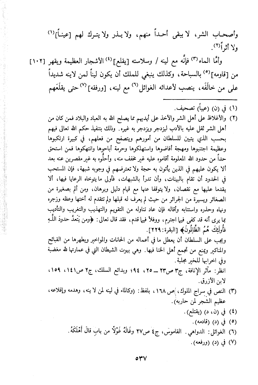 وَأما المَاء فَإِنَّهُ مَعَ لينه وسلاسته يقْلع الْأَشْجَار الْعَظِيمَة ويقهر من قاومه بالسباحة وَكَذَلِكَ يَنْبَغِي للْملك أَن يكون لينًا لمن لاينه شَدِيدا على من خَالفه ينصب لأعدائه الغوائل مَعَ لينه ورفقه حَتَّى يقلعهم