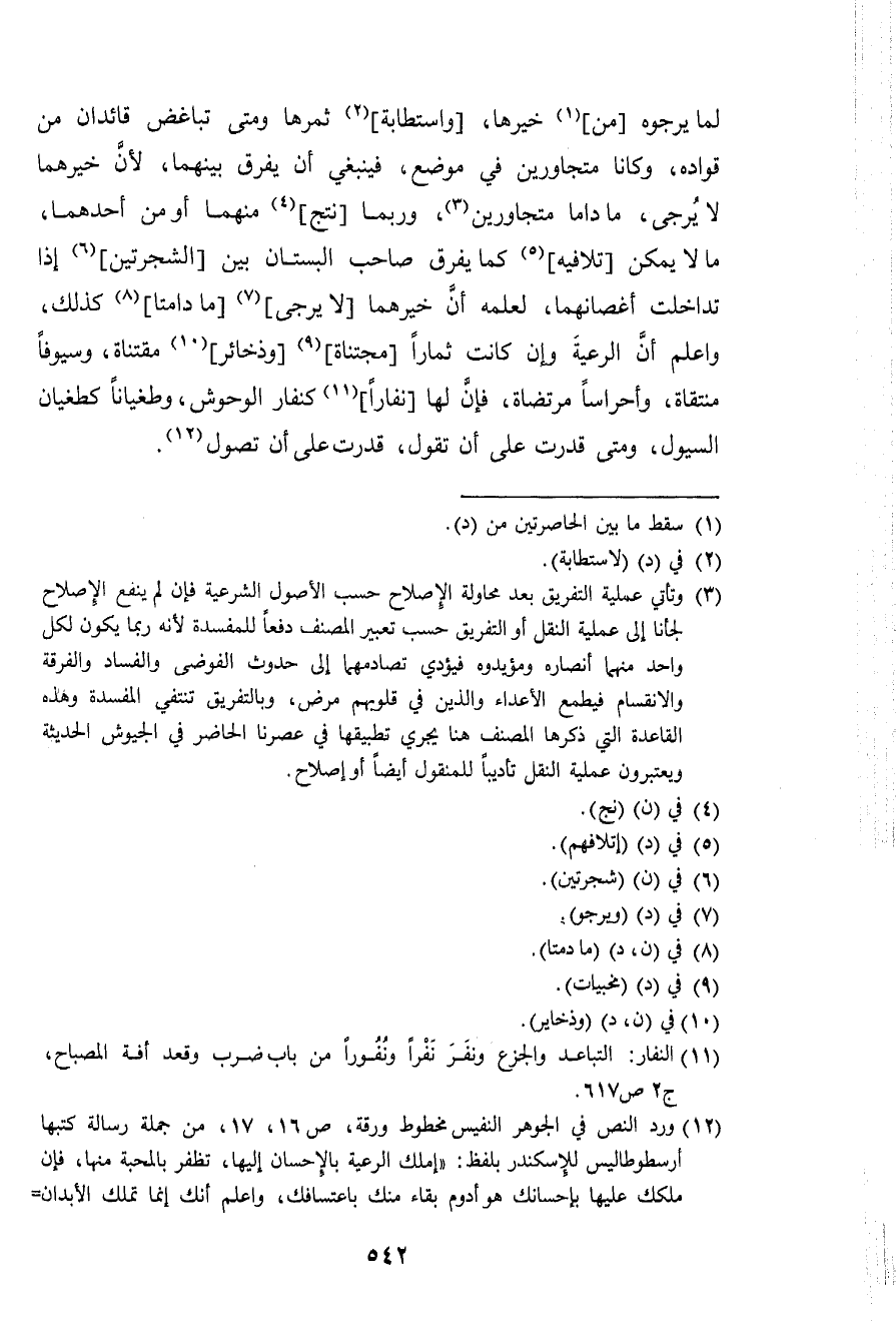 لما يرجوه من خَيرهَا واستطابة ثَمَرهَا وَمَتى تباغض قائدان من قواده وَكَانَا متجاورين فِي مَوضِع فَيَنْبَغِي أَن يفرق بَينهمَا لِأَن خيرهما لَا يُرْجَى مَا داما متجاورين وَرُبمَا نتج مِنْهُمَا أَو من أَحدهمَا مَا لَا يُمكن تلافيه كَمَا يفرق صَاحب الْبُسْتَان بَين الشجرتين إِذا تداخلت أغصانهما لعلمه أَن خيرهما لَا يُرْجَى مَا دامتا كَذَلِك وَاعْلَم أَن الرّعية وَإِن كَانَت ثمارا مجتناة وذخائر مقتناة وسيوفا منتقاة وأحراسا مرتضاة فَإِن لَهَا نفارا كنفار الوحوش وطغيانا كطغيان السُّيُول وَمَتى قدرت على أَن تَقول قدرت على أَن تصول