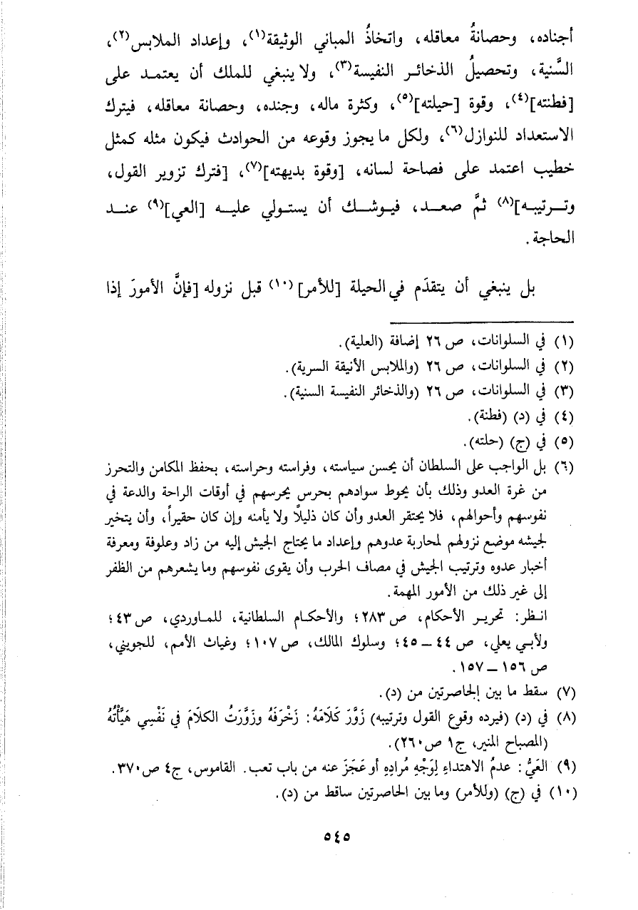 أجناده وحصانه معاقله واتخاذ المباني الْوَثِيقَة وإعداد الملابس السّنيَّة وَتَحْصِيل الذَّخَائِر النفيسة وَلَا يَنْبَغِي للْملك أَن يعْتَمد على فطنته وَقُوَّة حيلته وَكَثْرَة مَاله وجنده وحصانه معاقلة فَيتْرك الاستعداد للنوازل وَلكُل مَا يجوز وُقُوعه من الْحَوَادِث فَيكون مثله كَمثل خطيب اعْتمد على فصاحة لِسَانه وَقُوَّة بديهته فَترك تزوير القَوْل وترتيبه ثمَّ صعد فيوشك أَن يستولي عَلَيْهِ العي عِنْد الْحَاجة