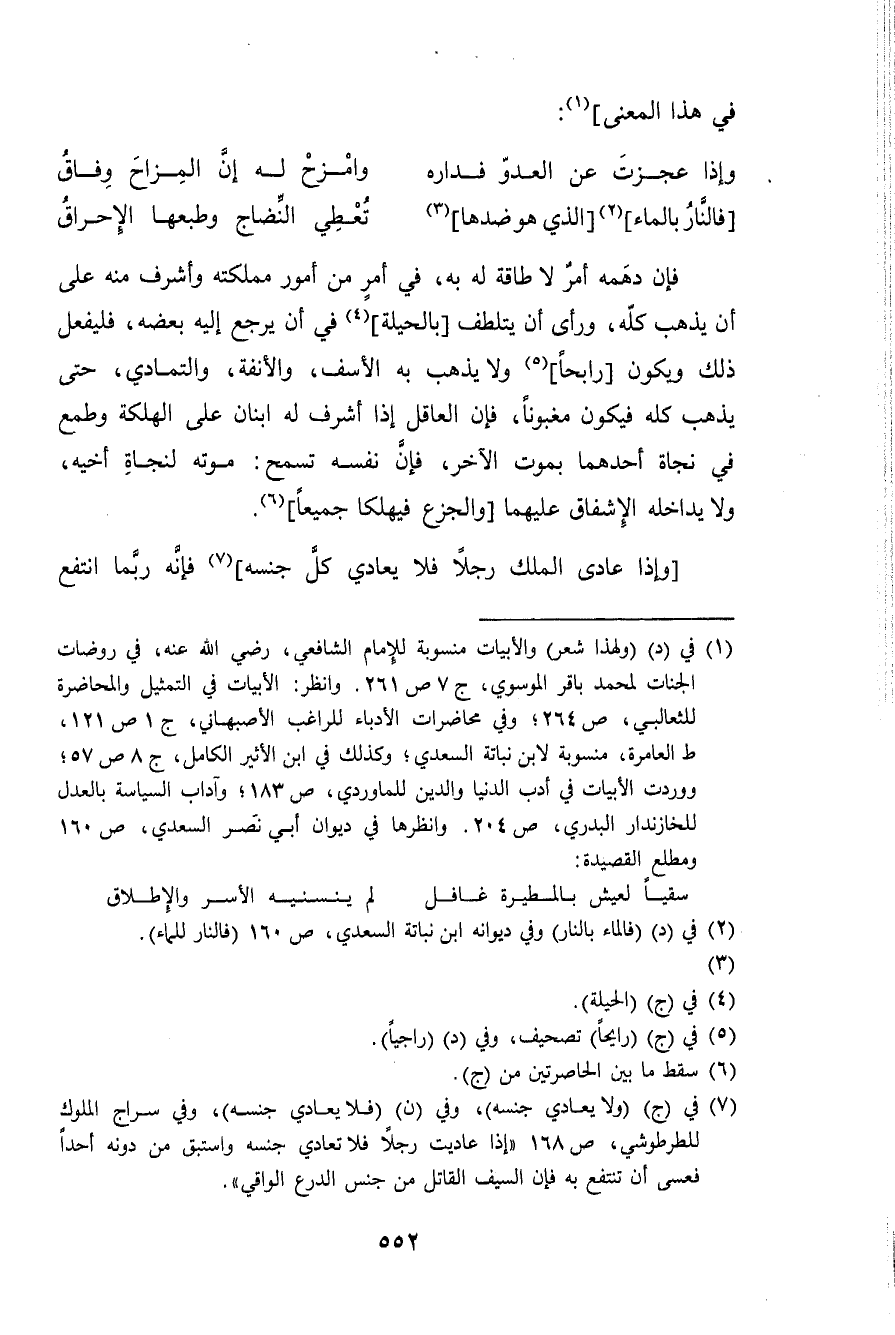 فَإِن دهمه أَمر لَا طَاقَة لَهُ بِهِ فِي أَمر من أُمُور مَمْلَكَته وأشرف مِنْهُ على أَن يذهب كُله وَرَأى أَن يتلطف بالحيلة فِي أَن يرجع إِلَيْهِ بعضه فَلْيفْعَل ذَلِك وَيكون رابحا وَلَا يذهب بِهِ الأسف والأنفة والتمادي حَتَّى يذهب كُله فَيكون مغبونا فَإِن الْعَاقِل إِذا أشرف لَهُ ابْنَانِ على الهلكة وطمع فِي نجاة أَحدهمَا بِمَوْت الآخر فَإِن نَفسه تسمح مَوته لنجاة أَخِيه وَلَا يداخله الإشفاق عَلَيْهِمَا والجزع فيهلكا جَمِيعًا