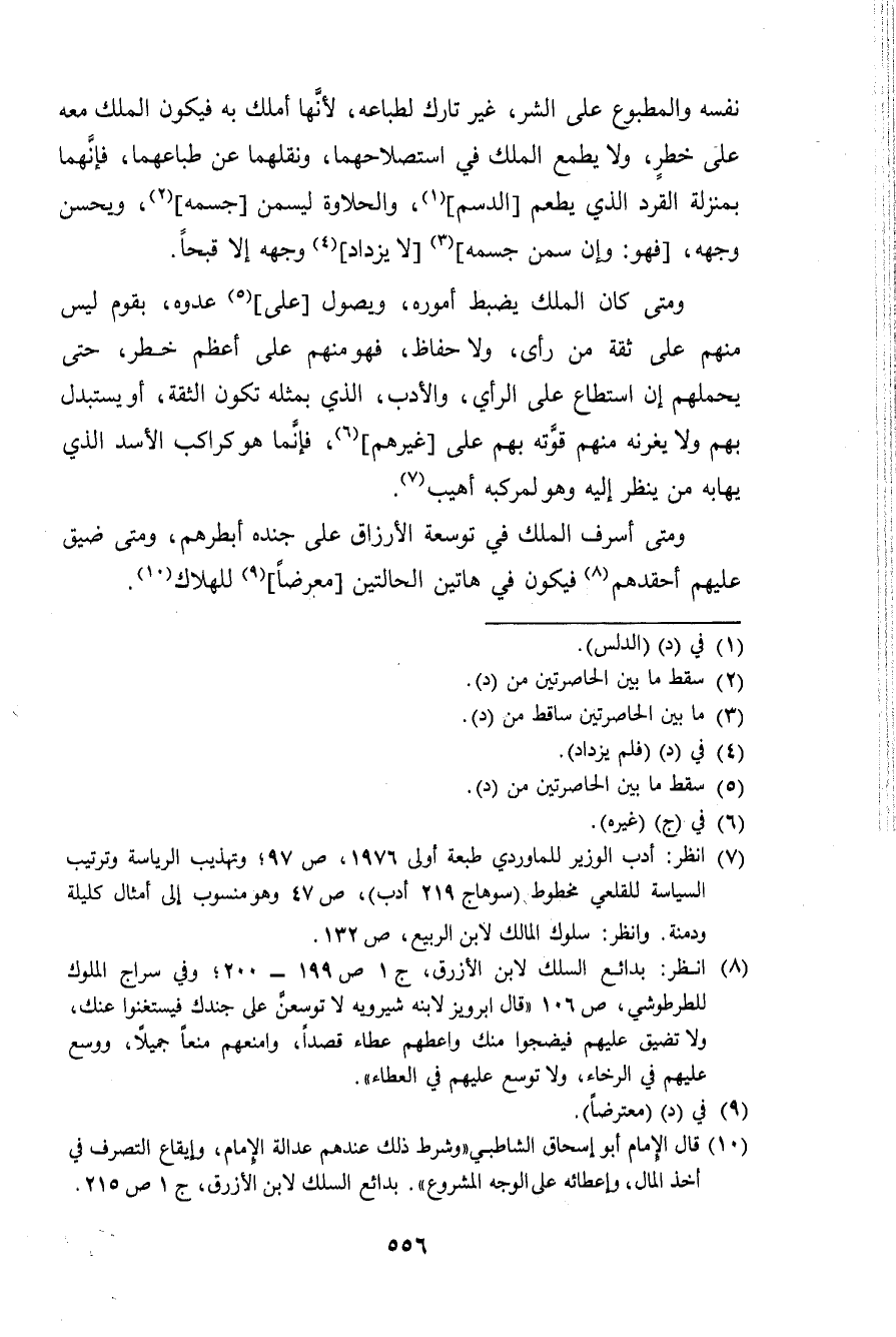 وَمَتى أسرف الْملك فِي توسعة الأرزاق على جنده أبطرهم وَمَتى ضيق عَلَيْهِم أحقدهم فَيكون فِي هَاتين الْحَالَتَيْنِ معرضًا للهلاك