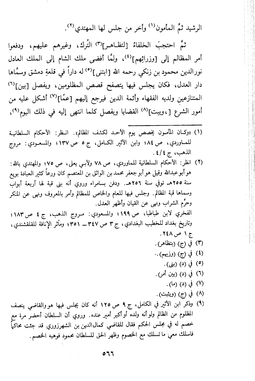 ثمَّ احتجب الْخُلَفَاء لتظاهر التّرْك وَغَيرهم عَلَيْهِم ودفعوا أَمر الْمَظَالِم إِلَى وزرائهم وَلما أفْضى ملك الشَّام إِلَى الْملك الْعَادِل نور الدّين مَحْمُود بن زنكي رَحمَه الله ابنتى لَهُ دَارا فِي قلعة دمشق وسماها دَار الْعدْل فَكَانَ يجلس فِيهَا يتصفح قصَص المظلومين ويفصل بَين المتنازعين ولديه الْفُقَهَاء وأئمة الدّين فَيرجع إِلَيْهِم عَمَّا أشكل عَلَيْهِ من أُمُور الشَّرْع ويبت القضايا ويفصل كلما انْتهى إِلَيْهِ فِي ذَلِك الْيَوْم