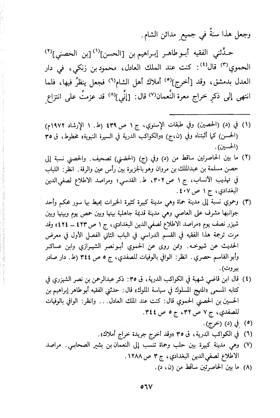 حَدثنِي الْفَقِيه أَبُو طَاهِر إِبْرَاهِيم بن الْحسن بن الحصني الْحَمَوِيّ قَالَ كنت عِنْد الْملك الْعَادِل مَحْمُود بن زنكي فِي دَار الْعدْل بِدِمَشْق وَقد أخرج أَمْلَاك أهل الشَّام فَجعل ينظر فِيهَا فَلَمَّا انْتهى إِلَى ذكر خراج معرة النُّعْمَان قَالَ إِنِّي قد عزمت على انتزاع