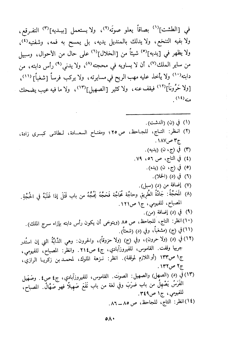 فِي الطشت بصاقا يَعْلُو صَوته وَلَا يسْتَعْمل بيدَيْهِ التفرقع وَلَا بِفِيهِ التنخع وَلَا يدلك بالمنديل يَدَيْهِ بل يمسح بِهِ فَمه وشفتيه وَلَا يظْهر فِي يَدَيْهِ شَيْئا من الْخلال على حَال من الْأَحْوَال وسبيل من ساير الْملك أَن لَا يُسَاوِيه فِي محجته وَلَا يدني رَأس دَابَّته من دَابَّته وَلَا يَأْخُذ عَلَيْهِ مهب الرّيح فِي مسايرته وَلَا يركب فرسا شغبا وَلَا حرونا فيقف عَنهُ وَلَا كثير الصهيل وَلَا مَا فِيهِ عيب يضْحك مِنْهُ