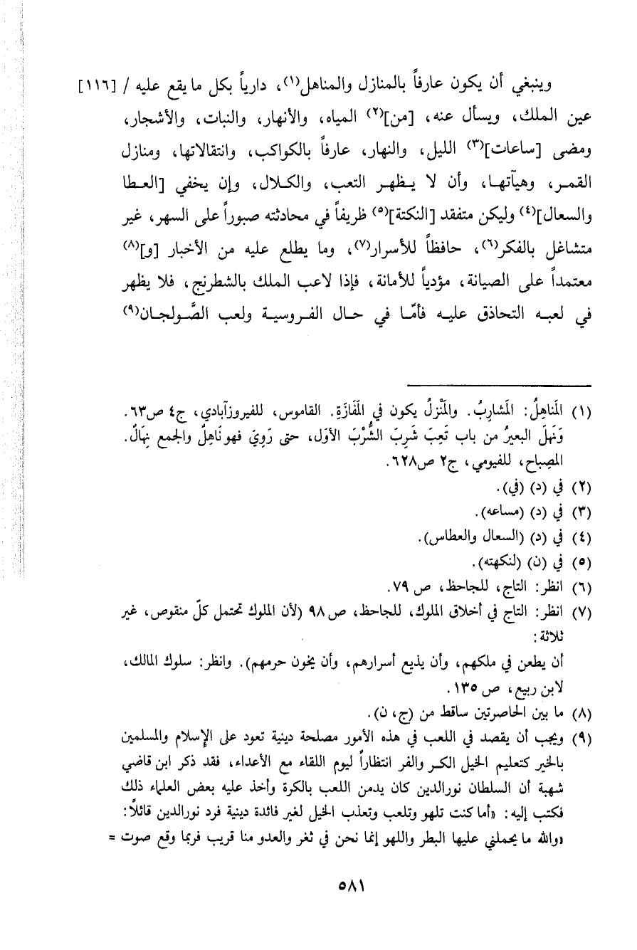 وَيَنْبَغِي أَن يكون عَارِفًا بالمنازل والمناهل داريا بِكُل مَا يَقع عَلَيْهِ عين الْملك وَيسْأل عَنهُ من الْمِيَاه والأنهار والنبات وَالْأَشْجَار وَمضى سَاعَات اللَّيْل وَالنَّهَار عَارِفًا بالكواكب وانتقالاتها ومنازل الْقَمَر وهيآتها وَأَن لَا يظْهر التَّعَب والكلال وَإِن يخفي العطا والسعال وَليكن متفقد النُّكْتَة ظريفا فِي محادثته صبورا على السهر غير متشاغل بالفكر حَافِظًا للأسرار وَمَا يطلع عَلَيْهِ من الْأَخْبَار ومعتمدا على الصيانة مُؤديا للأمانة فَإِذا لاعب الْملك بالشطرنج فَلَا يظْهر فِي لعبه التحاذق عَلَيْهِ فَأَما فِي حَال الفروسية وَلعب الصولجان