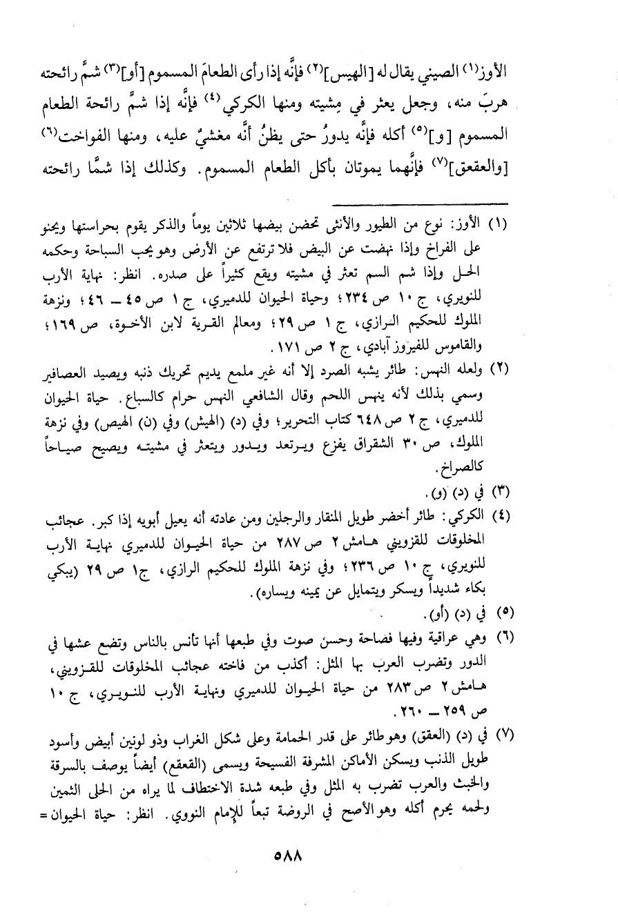 الأوز الصيني يُقَال لَهُ الهيس فَإِنَّهُ إِذا رأى الطَّعَام المسموم أَو شم رَائِحَته هرب مِنْهُ وَجعل يعثر فِي مشيته وَمِنْهَا الكركي فَإِنَّهُ إِذا شم رَائِحَة الطَّعَام المسموم وَأكله فَإِنَّهُ يَدُور حَتَّى يظنّ أَنه مغشي عَلَيْهِ وَمِنْهَا الفواخت والعقعق فَإِنَّهُمَا يموتان بِأَكْل الطَّعَام المسموم وَكَذَلِكَ إِذا شما رَائِحَته