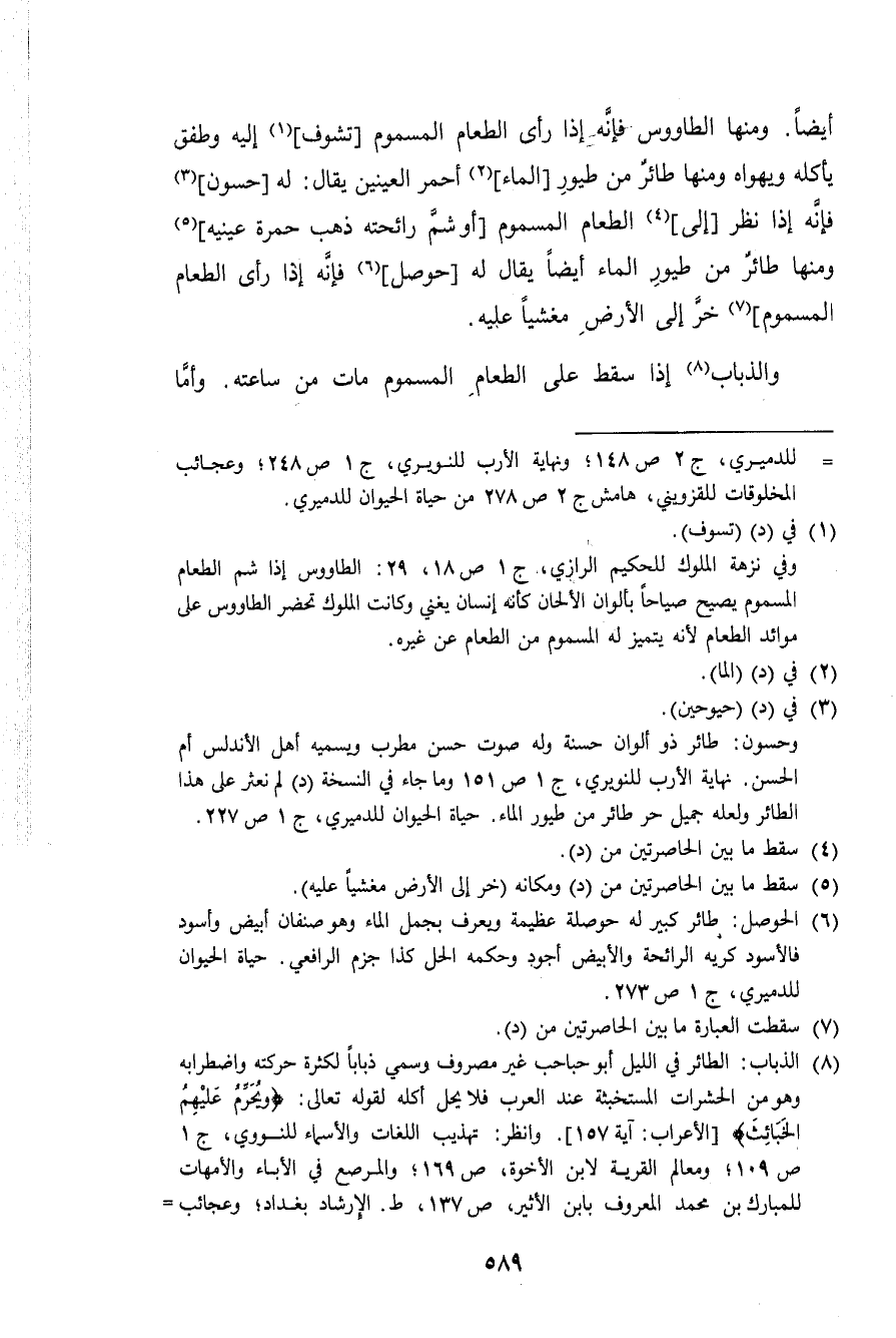 أَيْضا وَمِنْهَا الطاووس فَإِنَّهُ إِذا رأى الطَّعَام المسموم تشوف إِلَيْهِ وطفق يَأْكُلهُ ويهواه وَمِنْهَا طَائِر من طيور المَاء أَحْمَر الْعَينَيْنِ يُقَال لَهُ حسون فَإِنَّهُ إِذا نظر إِلَى الطَّعَام المسموم أَو شم رَائِحَته ذهب حمرَة عَيْنَيْهِ وَمِنْهَا طَائِر من طيور المَاء أَيْضا يُقَال لَهُ حوصل فَإِنَّهُ إِذا رأى الطَّعَام المسموم خر إِلَى الأَرْض مغشيا عَلَيْهِ