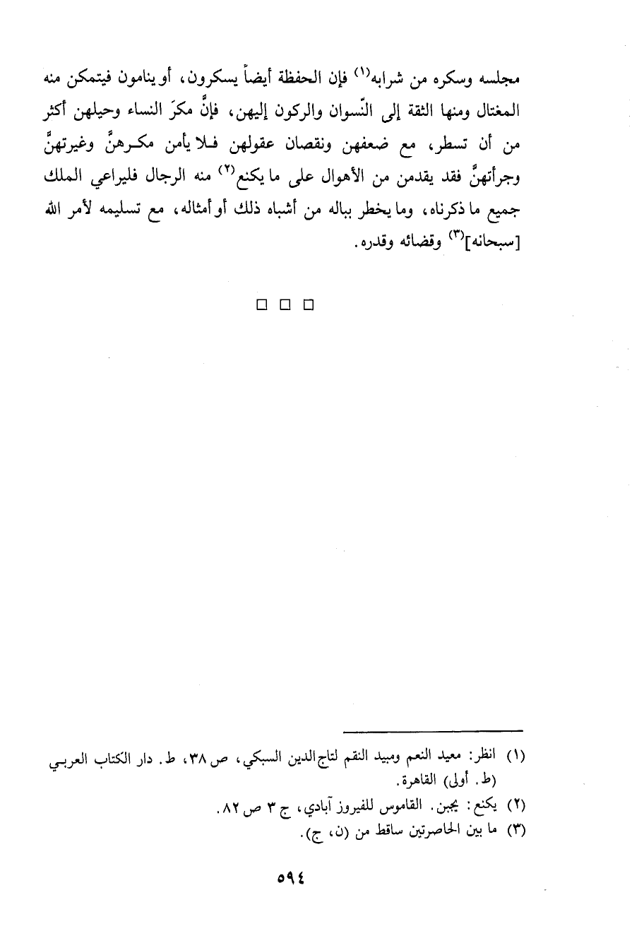 مَجْلِسه وسكره من شرابه فَإِن الْحفظَة أَيْضا يسكرون أَو ينامون فيتمكن مِنْهُ المغتال وَمِنْهَا الثِّقَة إِلَى النسوان والركون إلَيْهِنَّ فَإِن مكر النِّسَاء وحيلهن أَكثر من أَن تسطر مَعَ ضعفهن ونقصان عقولهن فَلَا يَأْمَن مكرهن وغيرتهن وجرأتهن فقد يقدمن من الْأَهْوَال على مَا يكنع مِنْهُ الرِّجَال فليراعي الْملك جَمِيع مَا ذَكرْنَاهُ وَمَا يخْطر بِبَالِهِ من أشباه ذَلِك أَو أَمْثَاله مَعَ تَسْلِيمه لأمر الله سُبْحَانَهُ وقضائه وَقدره