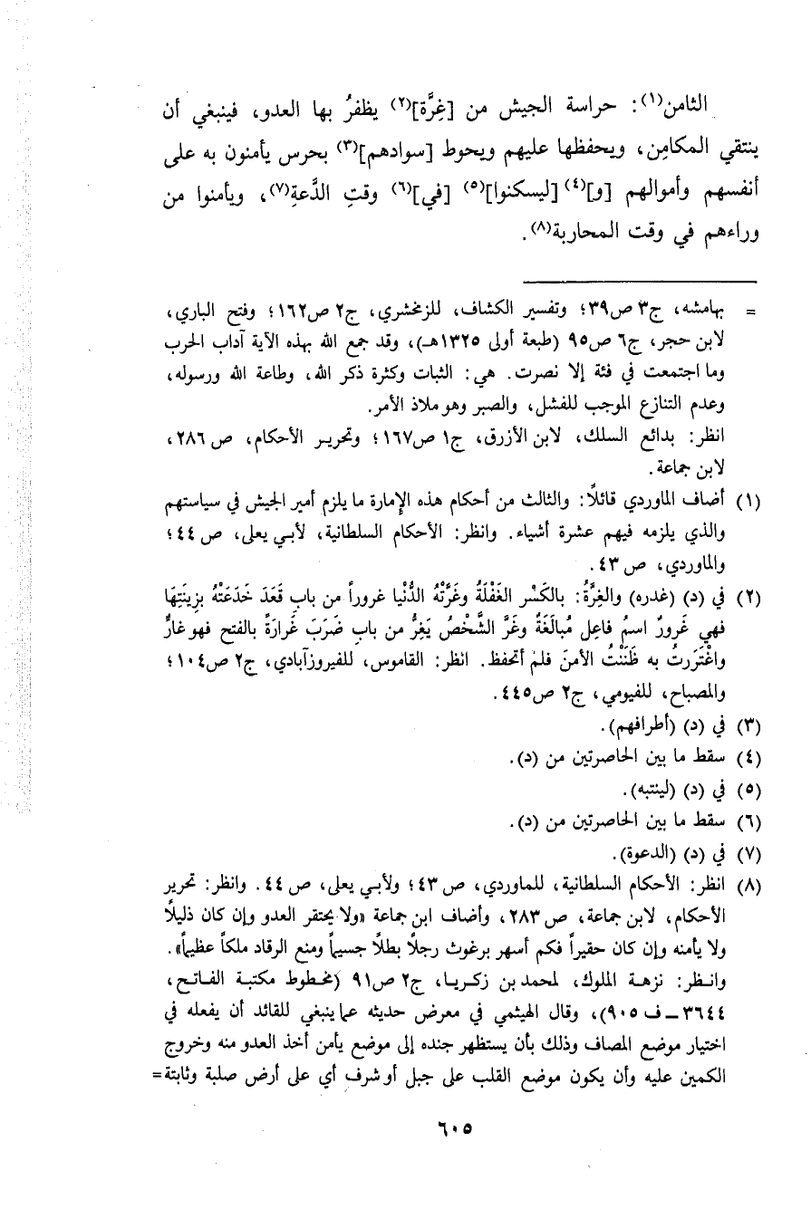 الثَّامِن حراسة الْجَيْش من غرَّة يظفر بهَا الْعَدو فَيَنْبَغِي أَن ينتقي المكامن ويحفظها عَلَيْهِم ويحوط سوادهم بحرس يأمنون بِهِ على أنفسهم واموالهم وليسكنوا فِي وَقت الدعة ويأمنوا من وَرَاءَهُمْ فِي وَقت الْمُحَاربَة
