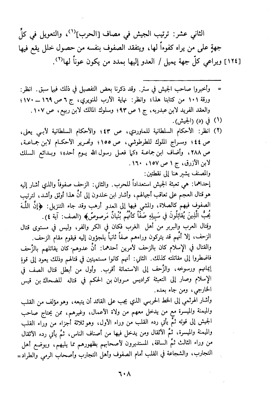 الثَّانِي عشر تَرْتِيب الْجَيْش فِي مصَاف الْحَرْب والتعويل فِي كل جِهَة على من يرَاهُ كفرءا لَهَا ويتفقد الصُّفُوف بِنَفسِهِ من حُصُول خلل يَقع فِيهَا ويراعي كل جِهَة يمِيل الْعَدو إِلَيْهَا بمدد من يكون عونا لَهَا 609