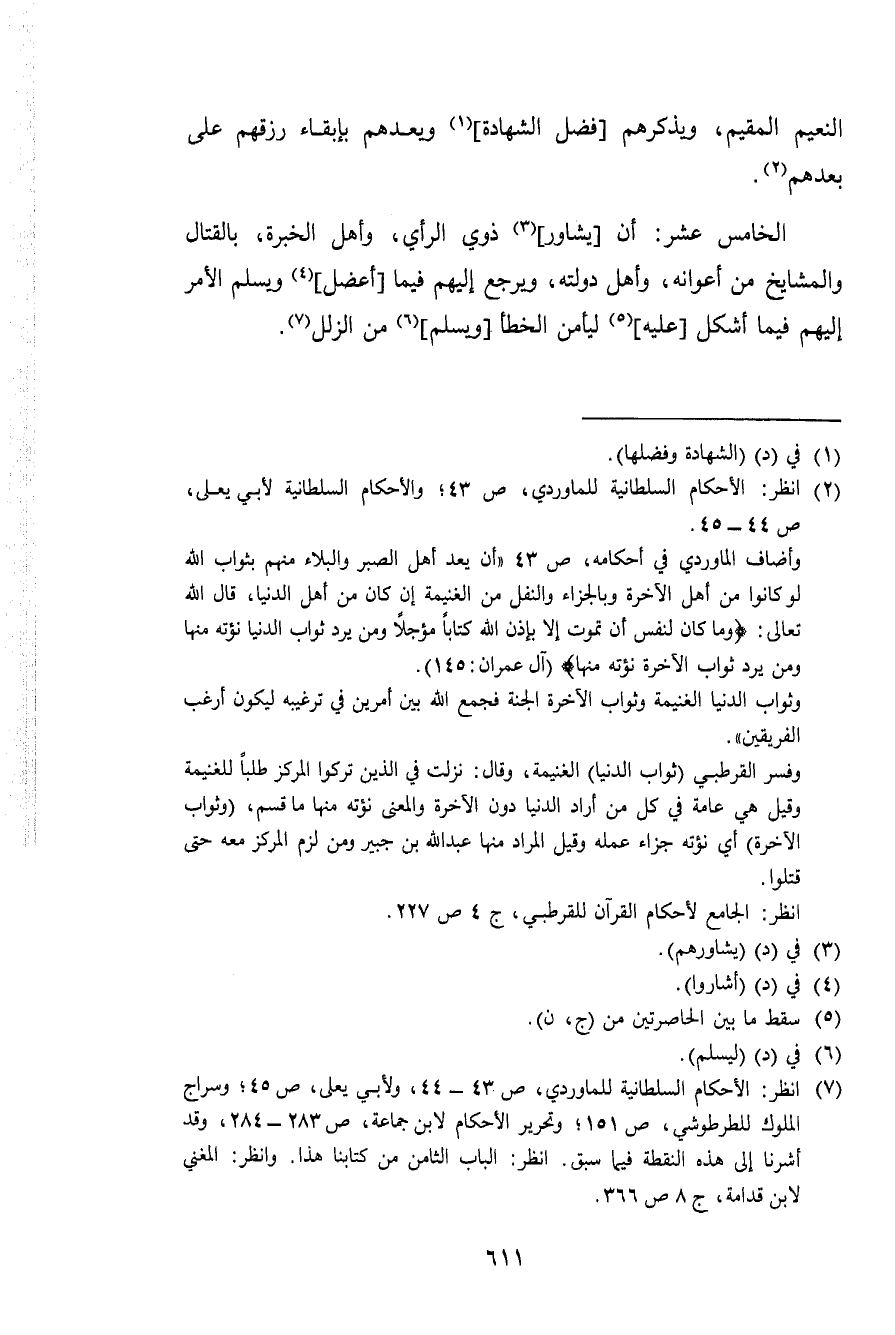 الْخَامِس عشر أَن يشاور ذَوي الرَّأْي وَأهل الْخِبْرَة بِالْقِتَالِ والمشايخ من أعوانه وَأهل دولته وَيرجع فِيمَا أعضل وَيسلم الامر إِلَيْهِم فِيمَا أشكل عَلَيْهِ ليأمن الْخَطَأ وَيسلم من الزلل