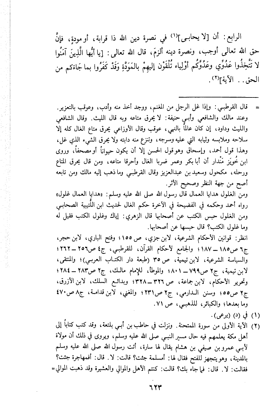 الرَّابِع أَن لَا يحابي فِي نَصره دين الله ذَا قرَابَة أَو مَوَدَّة فَإِن حق الله تَعَالَى أوجب ونصرة دينه ألزم قَالَ الله تَعَالَى {يَا أَيهَا الَّذين آمنُوا لَا تَتَّخِذُوا عدوي وَعَدُوكُمْ أَوْلِيَاء تلقونَ إِلَيْهِم بالمودة وَقد كفرُوا بِمَا جَاءَكُم من الْحق}