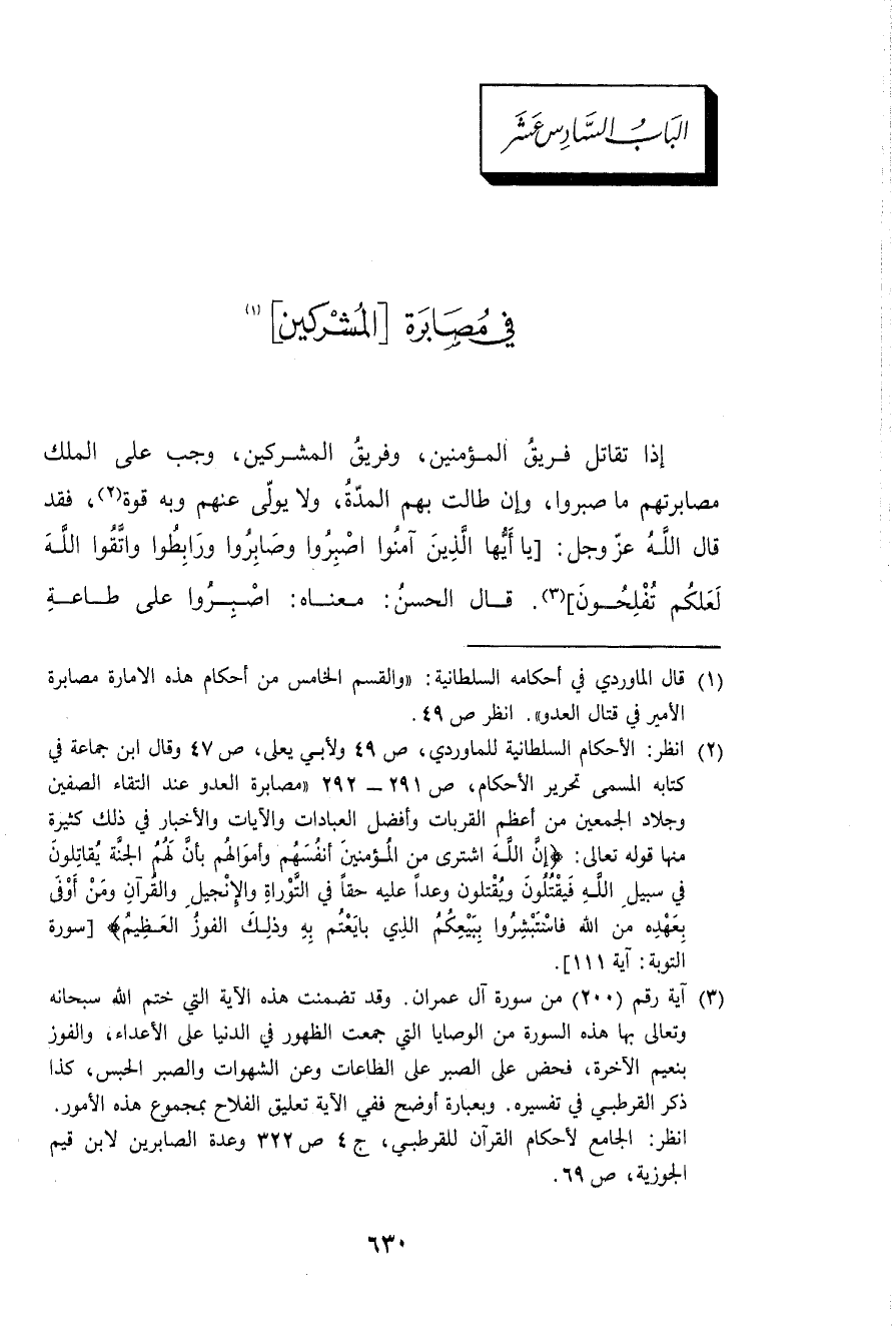 إِذا تقَاتل فريق الْمُؤمنِينَ وفريق الْمُشْركين وَجب على الْملك مصابرتهم مَا صَبَرُوا وَإِن طَالَتْ بهم الْمدَّة وَلَا يُولى عَنْهُم وَبِه قُوَّة فقد قَالَ الله عز وَجل {يَا أَيهَا الَّذين آمنُوا اصْبِرُوا وَصَابِرُوا وَرَابطُوا وَاتَّقوا الله لَعَلَّكُمْ تفلحون} قَالَ الْحسن مَعْنَاهُ اصْبِرُوا على طَاعَة
