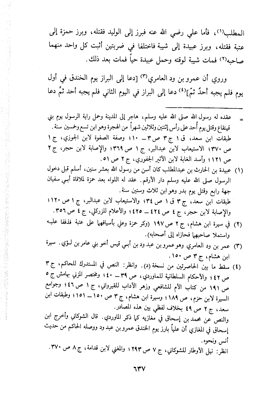 الْمطلب فَأَما عَليّ رَضِي الله عَنهُ فبرز إِلَى الْوَلِيد فَقتله وبرز حَمْزَة إِلَى عتبَة فَقتله وبرز عُبَيْدَة إِلَى شيبَة فاختلفا فِي ضربتين أثبت كل وَاحِد مِنْهُمَا صَاحبه فَمَاتَ شيبَة لوقته وَحمل عُبَيْدَة حَيا فَمَاتَ بعد ذَلِك