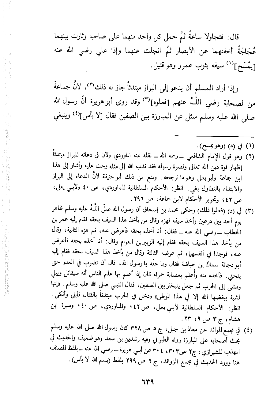 وَإِذا أَرَادَ الْمُسلم أَن يَدْعُو إِلَى البرَاز مبتدئا جَازَ لَهُ ذَلِك لِأَن جمَاعَة من الصَّحَابَة رَضِي الله عَنْهُم فَعَلُوهُ وَقد روى أَبُو هُرَيْرَة أَن رَسُول الله صلى الله عَلَيْهِ وَسلم سُئِلَ عَن المبارزة بَين الصفين فَقَالَ لَا بَأْس وَيَنْبَغِي