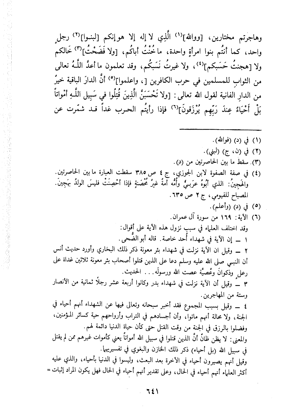 وهاجرتم مختارين وَوَاللَّه الَّذِي لَا إِلَه إِلَّا هُوَ إِنَّكُم لبنوا رجل وَاحِد كَمَا أَنْتُم بنوا امْرَأَة وَاحِدَة مَا خُنْت أَبَاكُم وَلَا فضحت خالكم وَلَا هجنت حسبكم وَلَا غيرت نسبكم وَقد تعلمُونَ مَا أعد الله تَعَالَى من الثَّوَاب للْمُسلمين فِي حَرْب الْكَافرين وَاعْلَمُوا أَن الدَّار الْبَاقِيَة خير من الدَّار الفانية لقَوْل الله تَعَالَى {وَلَا تحسبن الَّذين قتلوا فِي سَبِيل الله أَمْوَاتًا بل أَحيَاء عِنْد رَبهم يرْزقُونَ} فَإِذا رَأَيْتُمْ الْحَرْب غَدا قد شمرت عَن