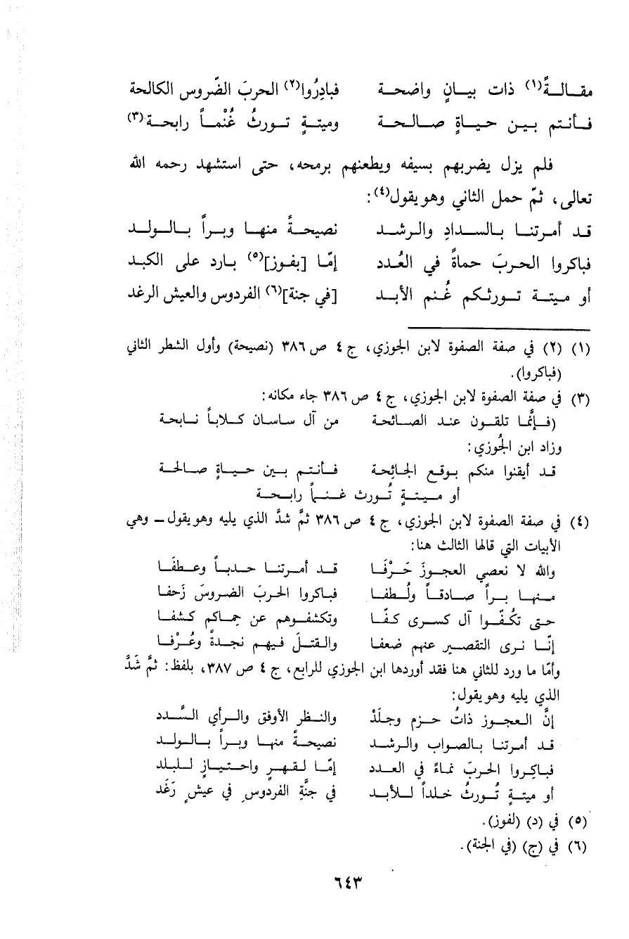 (مقَالَة ذَات بَيَان وَاضِحَة ... فبادروا الْحَرْب الضروس الكالحة)