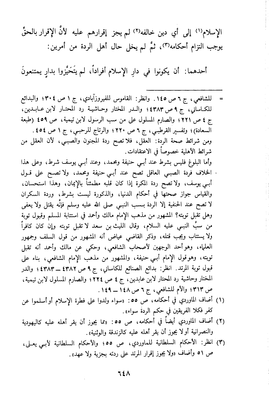 الْإِسْلَام إِلَى أَي دين خَالفه لم يجز إقرارهم عَلَيْهِ لِأَن الْإِقْرَار بِالْحَقِّ يُوجب الْتِزَام أَحْكَامه ثمَّ لم يخل حَال أهل الرِّدَّة من أَمريْن