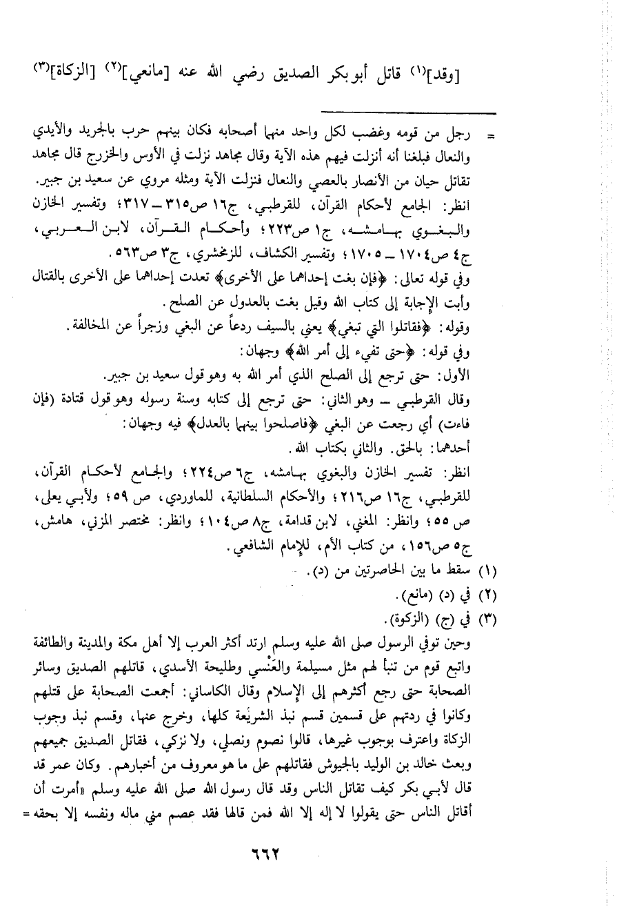 وَقد قَاتل أَبُو بكر الصّديق رَضِي الله عَنهُ مانعي الزَّكَاة
