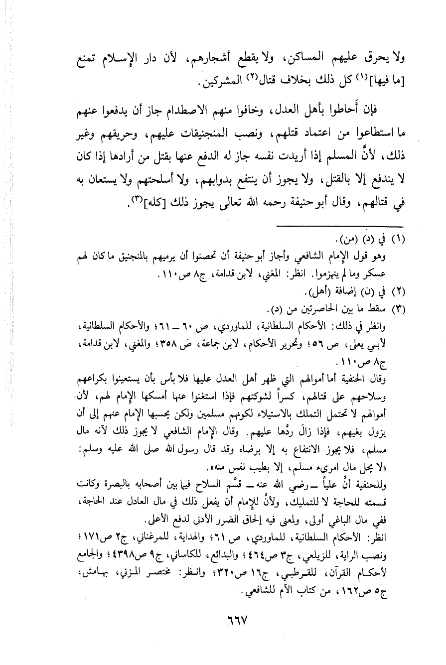 فَإِن أحاطوا بِأَهْل الْعدْل وخافوا مِنْهُم الاصطدام جَازَ أَن يدفعوا عَنْهُم مَا اسْتَطَاعُوا من اعْتِمَاد قَتلهمْ وَنصب المنجنيقات عَلَيْهِم وحريقهم وَغير ذَلِك لِأَن الْمُسلم إِذا أريدت نَفسه جَازَ لَهُ الدّفع عَنْهَا بقتل من أرادها إِذا كَانَ لَا ينْدَفع إِلَّا بِالْقَتْلِ وَلَا يجوز أَن ينْتَفع بدوابهم وَلَا أسلحتهم وَلَا يستعان بِهِ فِي قِتَالهمْ وَقَالَ أَبُو حنيفَة رَحمَه الله تَعَالَى يجوز ذَلِك كُله