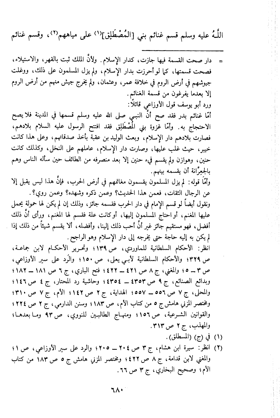الله عَلَيْهِ وَسلم قسم غَنَائِم بني المصطلق على مِيَاههمْ وَقسم غَنَائِم