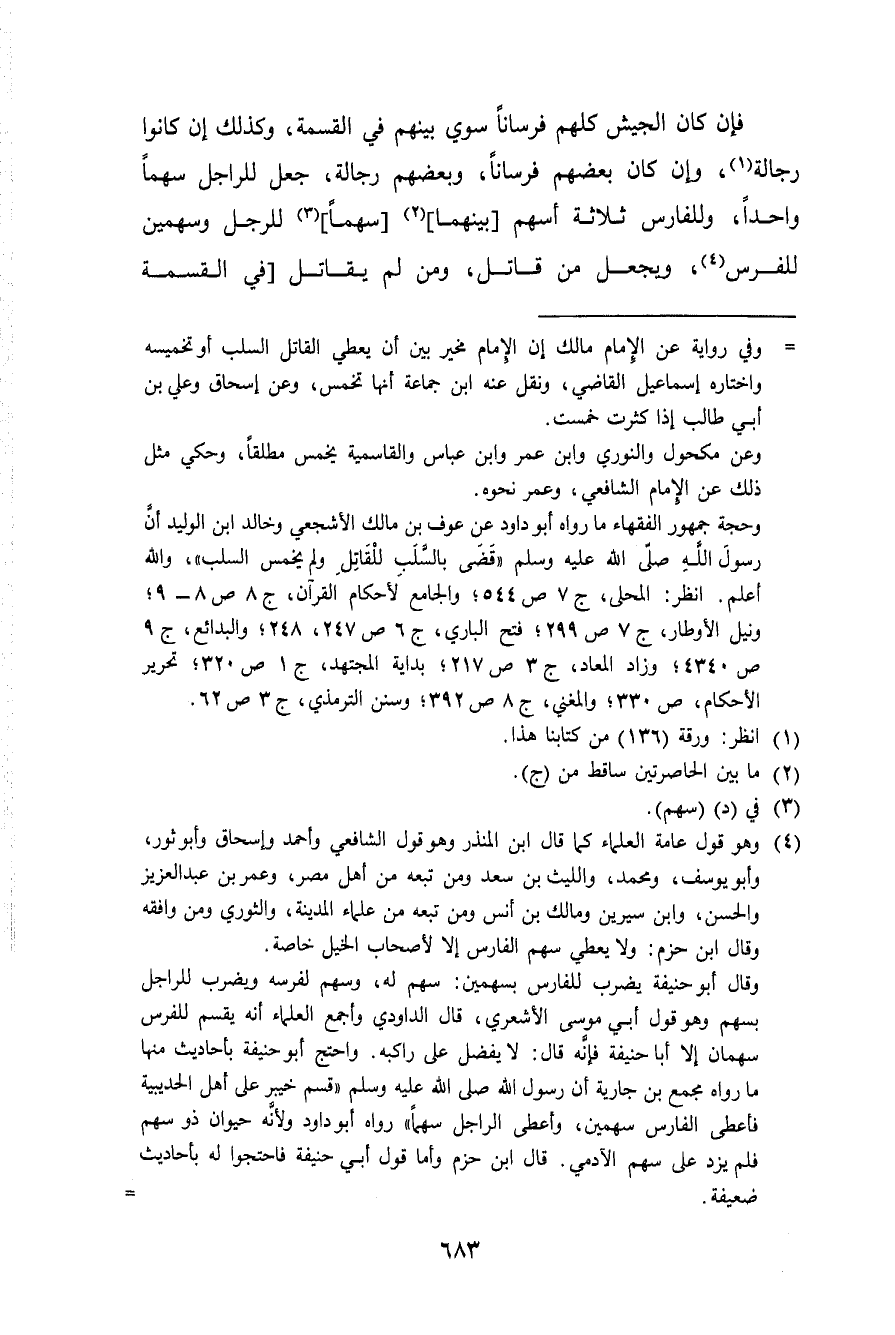 فَإِن كَانَ الْجَيْش كلهم فُرْسَانًا سوي بَينهم فِي الْقِسْمَة وَكَذَلِكَ إِن كَانُوا رجالة وَإِن كَانَ بَعضهم فُرْسَانًا وَبَعْضهمْ رجالة جعل للراجل سَهْما وَاحِدًا وللفارس ثَلَاثَة أسْهم بَينهمَا سَهْما للرجل وسهمين للْفرس وَيجْعَل من قَاتل وَمن لم يُقَاتل فِي الْقِسْمَة