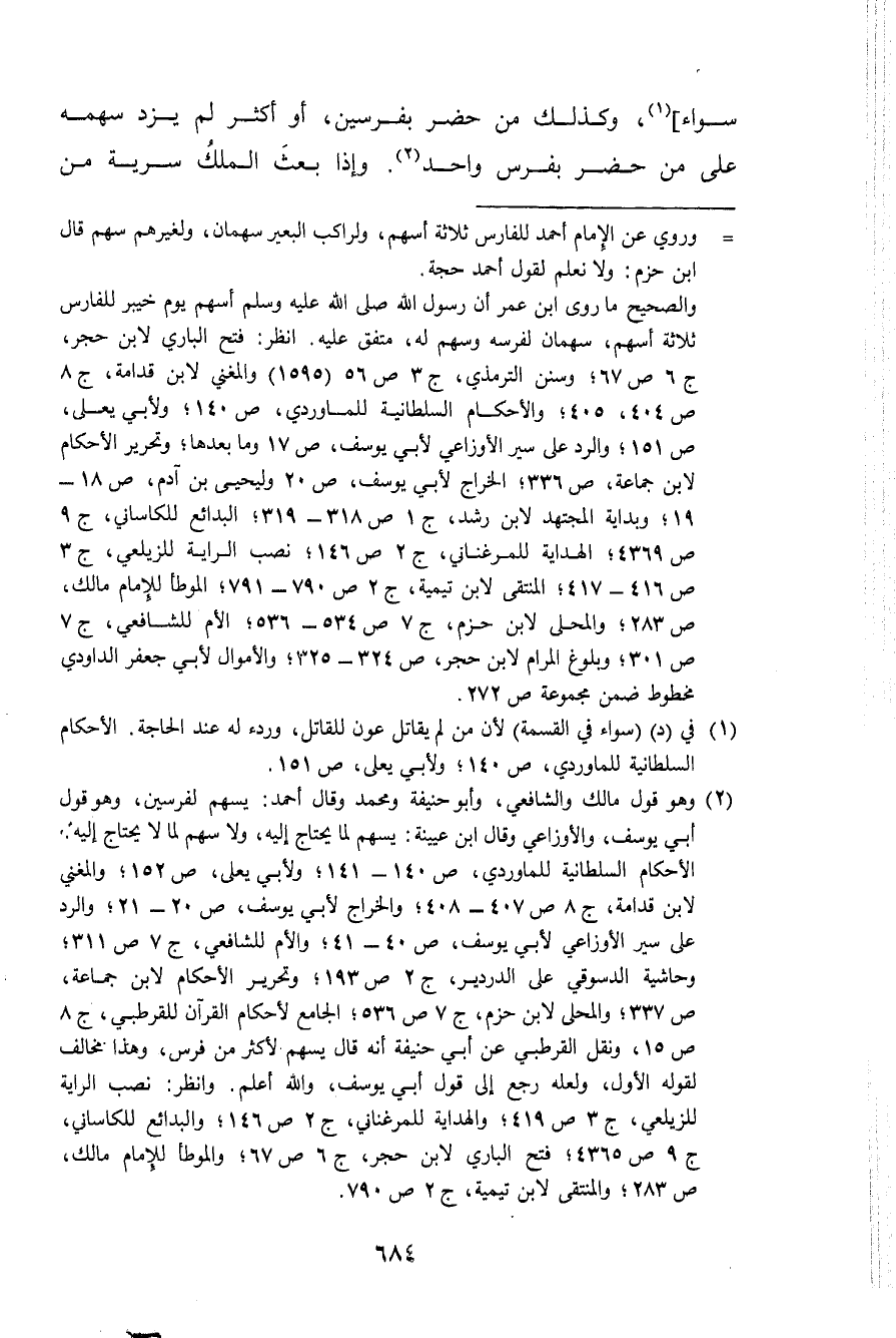 سَوَاء وَكَذَلِكَ من حضر بفرسين أَو أَكثر لم يزدْ سَهْمه على من حضر بفرس وَاحِد وَإِذا بعث الْملك سَرِيَّة من